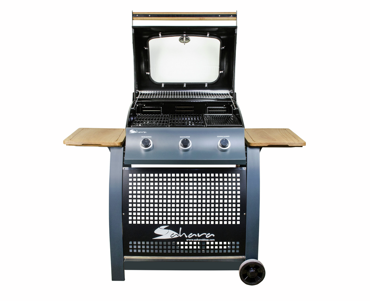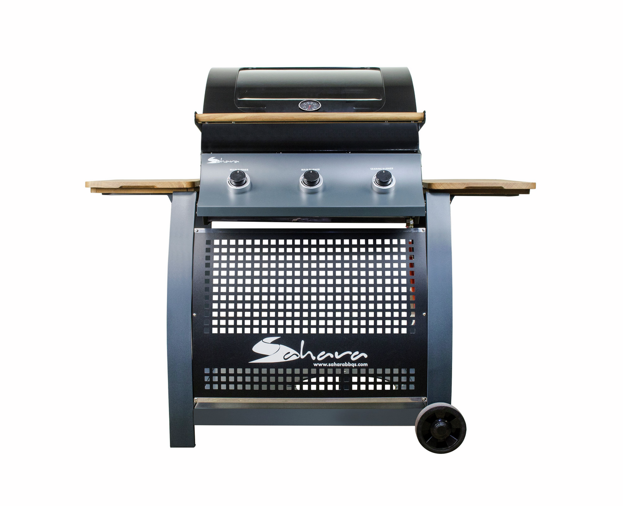 Гриль газовый разборный Sahara Oak BBQ 3 горелки из нержавеющей стали с чугунной решеткой на колесах 13,5 кВт 43кг, 120 x 147 x 72см