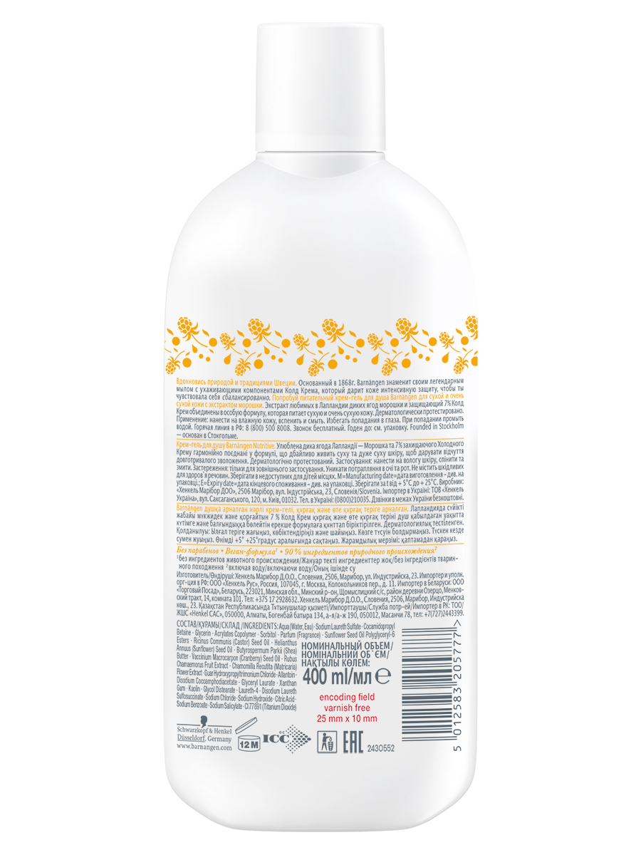 Попробуй питательный крем-гель для душа Barnangen для сухой и очень сухой кожи с экстрактом морошки. Экстракт любимых в Лапландии диких ягод морошки и защищающий 7% колд крем объединены в особую формулу, которая питает сухую и очень сухую кожу.