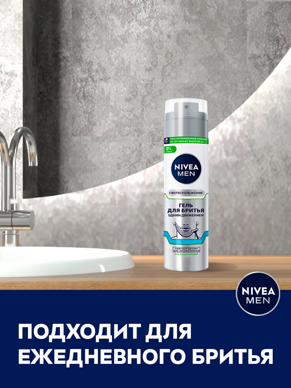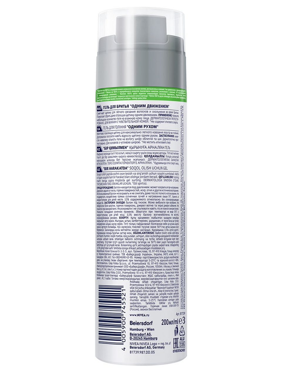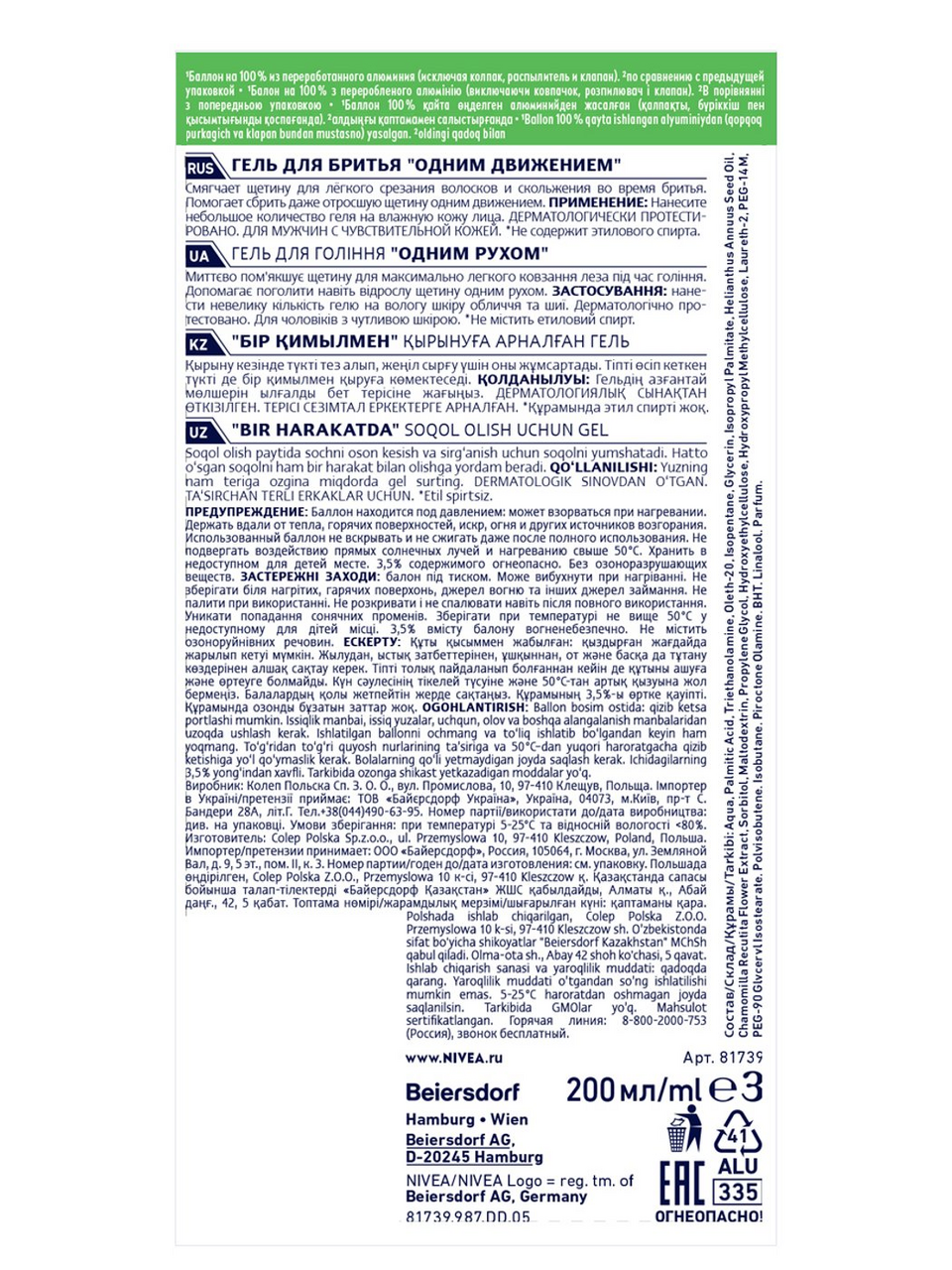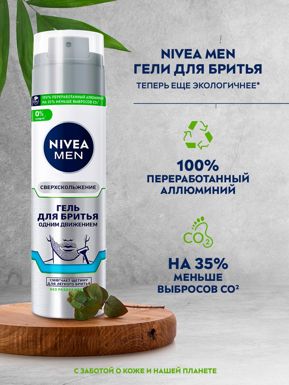 Nivea представляет гель Сверхскольжение для легкого бритья одним движением! Обогащенный экстрактами ромашки и гамамелиса, предотвращает пять признаков раздражения кожи: жжение, покраснение, сухость, ощущения стянутости и зуда. Гель моментально превращается в мягкую эластичную пену и собирает волосок к волоску для максимально четкого бритья. Гель обеспечивает сверхскольжение бритвы по коже, смягчает даже отросшую щетину, не вызывает раздражения. Не содержит спирта и не вызывает раздражение на коже - подходит даже для чувствительной кожи. Применение: хорошо встряхните перед использованием, держите баллон вертикально при выдавливании. Распределите по лицу, побрейтесь. Для дополнительного увлажнения и ухода за кожей используйте лосьон или бальзам Nivea после каждого бритья.