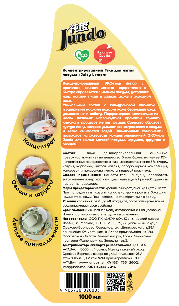 Концентрированный Гель Jundo c ароматом сочного лимона эффективно и быстро справляется с мытьем посуды, устраняет жир, остатки пищи и запахи, даже в холодной воде. Уникальный состав с гиалуроновой кислотой и эфирными маслами подарят коже бережный уход, увлажнение и заботу. Парфюмерная композиция из масел позволит наслаждаться ароматом сочного лимона в процессе мытья посуды. Средство образует густую пену, которая удаляет все загрязнения с посуды и легко смывается водой. Экологичные компоненты позволяют использовать концентрированный Гель Jundo для мытья детской посуды, игрушек, фруктов и овощей. Концентрированного состава с формулой 1=3 хватит надолго. Удобный и красивый перламутровый флакон с дозатором позволит Вам контролировать расход геля. Одной капли вам будет достаточно для мытья большого количества посуды.