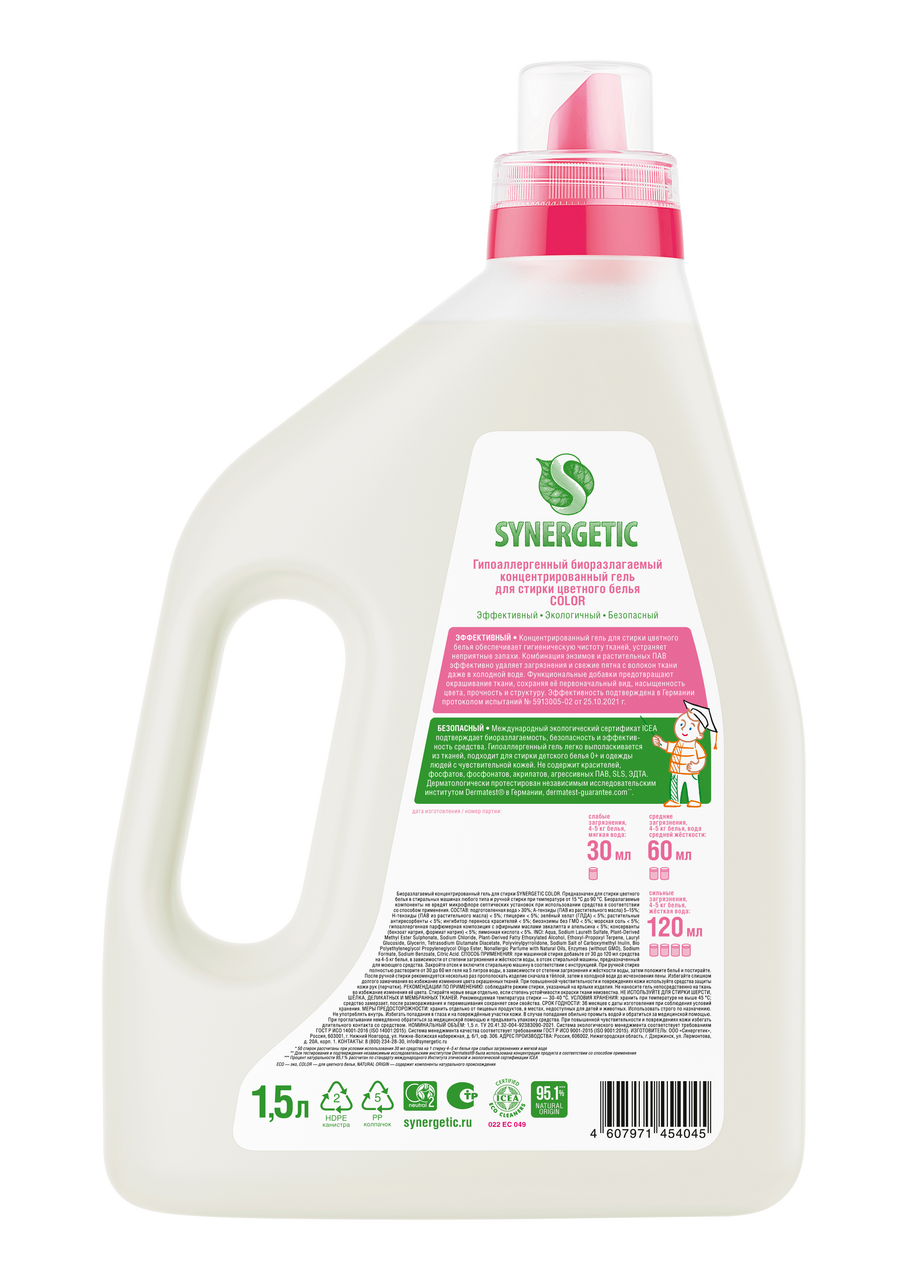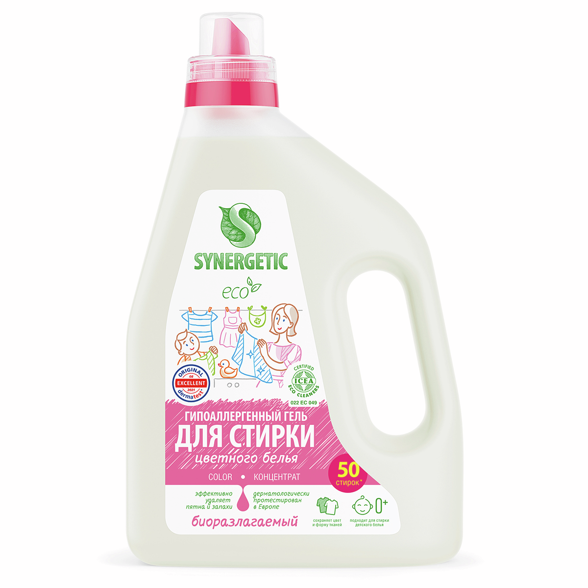 Биоразлагаемый концентрированный гель для стирки цветного белья Synergetic Color обеспечивает бережное и эффективное очищение тканей, гигиеническую чистоту одежды и устраняет неприятные запахи. Средство можно использовать в стиральных машинах любого типа и при ручной стирке при температуре 15 - 90C. Комбинация энзимов и растительных ПАВ эффективно удаляет трудновыводимые и свежие пятна с волокон ткани даже в холодной воде. Функциональные добавки предотвращают окрашивание ткани, сохраняя ее первоначальный вид, насыщенность цвета, прочность и структуру. Активные компоненты препятствуют образованию катышков, делая волокна более гладкими. Гипоаллергенная отдушка на основе эфирных масел эвкалипта и апельсина оставляет легкий и приятный аромат. Гель предназначен для стирки всех видов тканей, кроме деликатных и мембранных, а также шерсти и шелка. Биоразлагаемый гель полностью выполаскивается из тканей, подходит для стирки детского белья 0+ и одежды людей с чувствительной кожей.