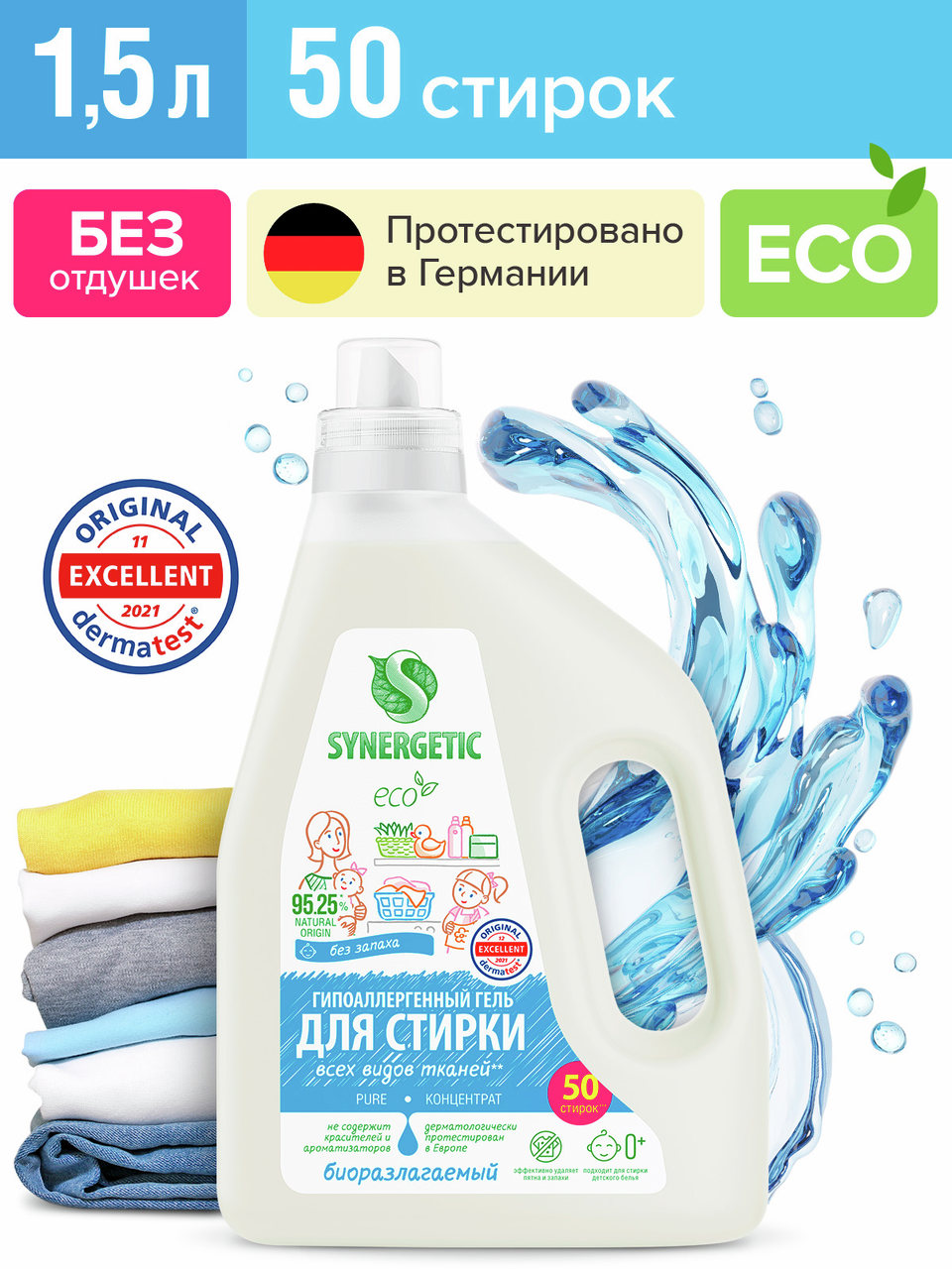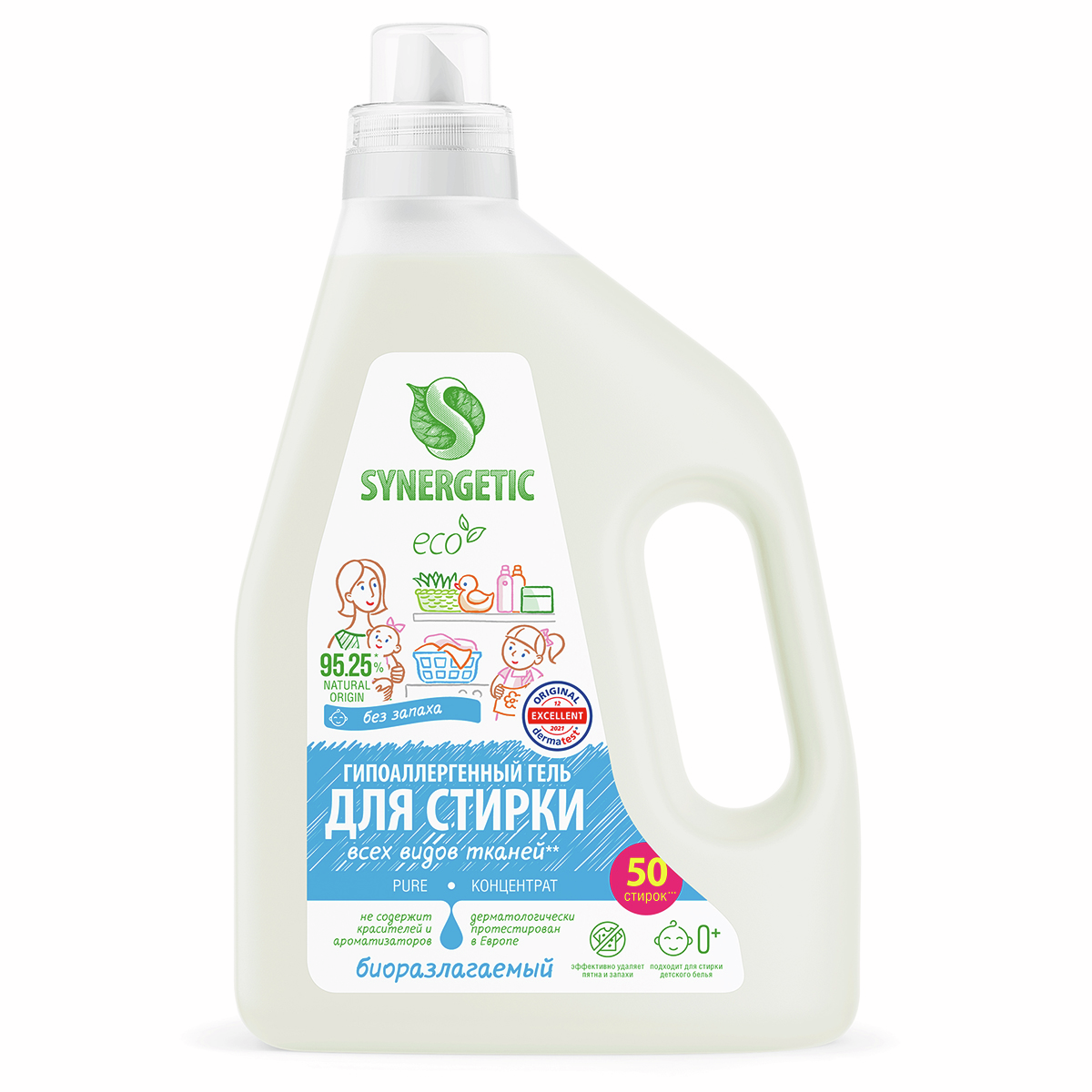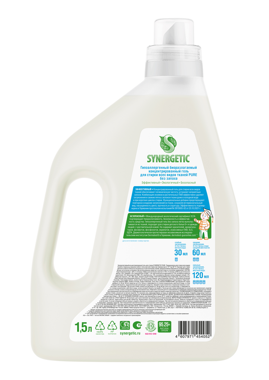 Биоразлагаемый концентрированный гель для стирки всех видов тканей Synergetic Pure обеспечивает бережное и эффективное очищение тканей, гигиеническую чистоту одежды и устраняет неприятные запахи. Средство можно использовать в стиральных машинах любого типа и при ручной стирке при температуре 15 - 90C. Комбинация энзимов и растительных ПАВ эффективно удаляет трудновыводимые и свежие пятна с волокон ткани даже в холодной воде и при коротких циклах стирки. Функциональные добавки предотвращают повторное оседание загрязнений на ткани, сохраняя ее первоначальный вид, насыщенность цвета, прочность и структуру. Активные компоненты препятствуют образованию катышков, делая волокна более гладкими. Гель подходит для стирки цветного и белого белья из натуральных и синтетических тканей, не предназначен для деликатных и мембранных материалов, а также шерсти и шелка. Биоразлагаемый гель полностью выполаскивается из тканей, подходит для стирки детского белья 0+ и одежды людей с чувствительной кожей.