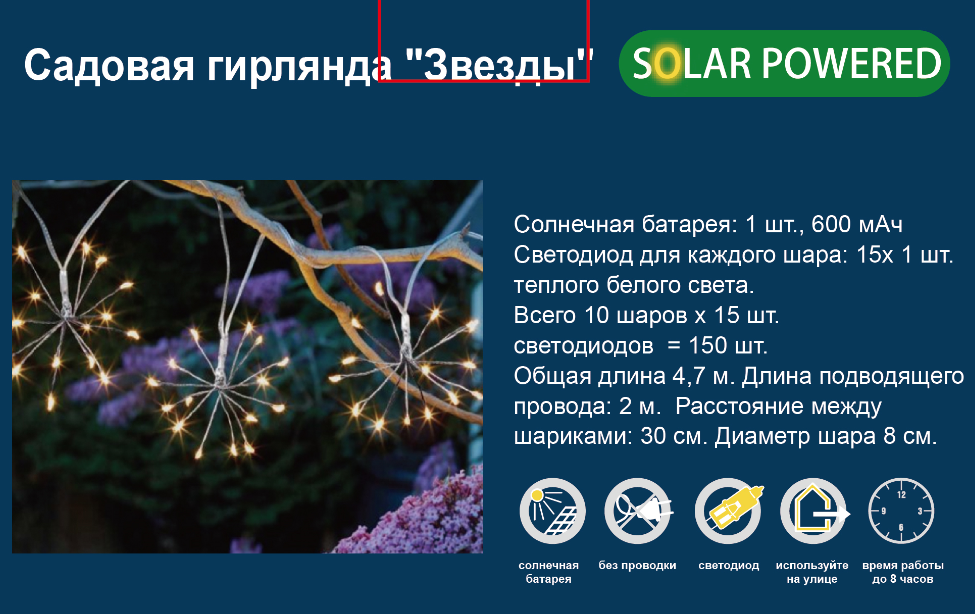 Гирлянда на солнечной батарее предназначена для декоративной подсветки на улице. Не требует подключения к сети, что сильно облегчает его установку. На гирлянде есть кнопка вкл/выкл для регулирования подсветки в темное время суток.