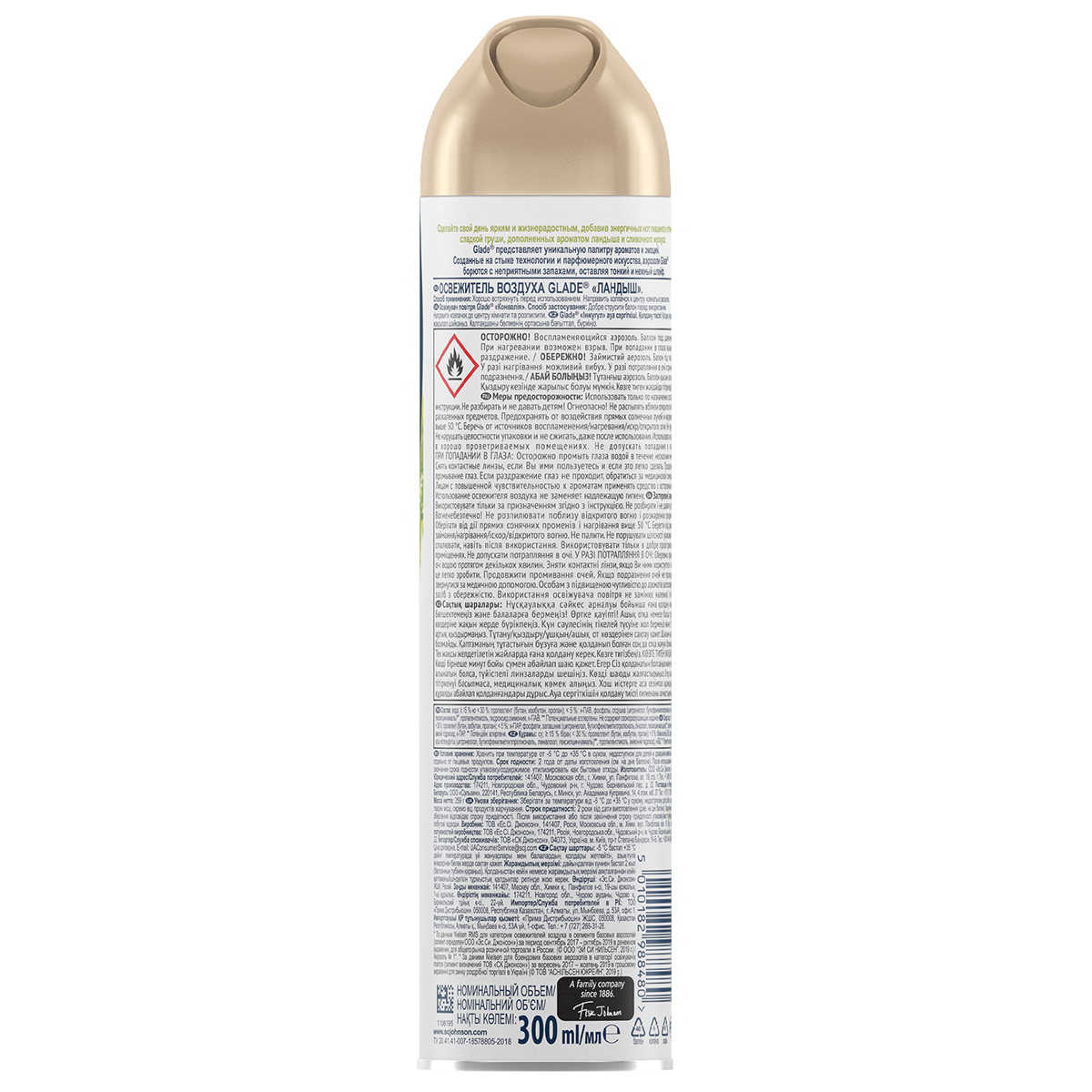 Данный продукт с максимальной скоростью удаляет неприятные запахи, оставляя за собой шлейф аромата ландышей. Аэрозоль очень прост в использовании. Одно легкое нажатие на клапан и спрей уже разносит аромат цветов по комнате. Освежитель воздуха Glade Ландыш – ваш помощник в устранении неприятных запахов. Легко справится с большими помещениями: кухня, гостиная или спальня. Большой объем позволяет использовать данный продукт на протяжении очень длительного времени. Компания Glade на протяжении долгого времени изготавливает только качественную продукцию, что заслуживает доверия от покупателей!