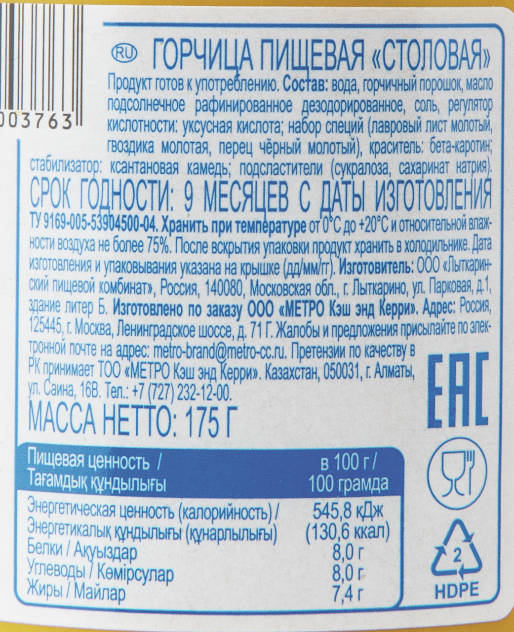 Вода, горчичный порошок, масло подсолнечное рафинированное дезодорированное, соль, регулятор кислотности (уксусная кислота), набор специй (лавровый лист молотый, гвоздика молотая, перец черный молотый), краситель (бета-каротин), стабилизатор (ксантановая камедь), подсластители (сукралоза, сахаринат натрия).