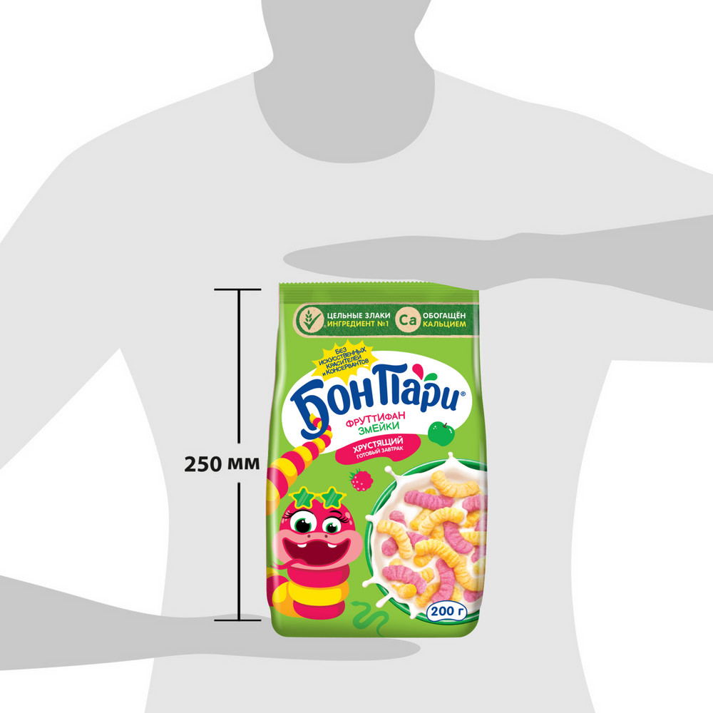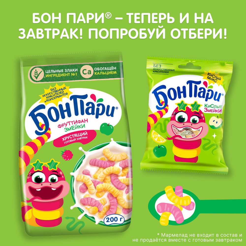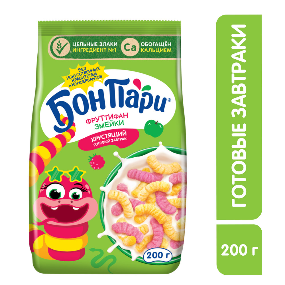 Встречайте известный бренд Бон Пари теперь в готовых завтраках. Порадуй себя и своих близких хрустящим полезным готовым завтраком Бон Пари. Фруттифан змейки:- Необычный фруктово-ягодный микс вкусов – сладко-кислое сочетание малины и яблока. - Оригинальная форма продукта в виде Фруттифан змеек - точно стоит попробовать. - Хрустящая текстура - завтрак сохраняет хруст даже после добавления молока. А также готовый завтрак содержит цельные злаки и обогащён кальцием, без искусственных красителей и консервантов. Для приготовления готового завтрака рекомендуется добавлять молоко комнатной температуры.