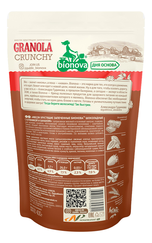 Гранола Bionova Шоколадная с клубникой и бананом, 400г