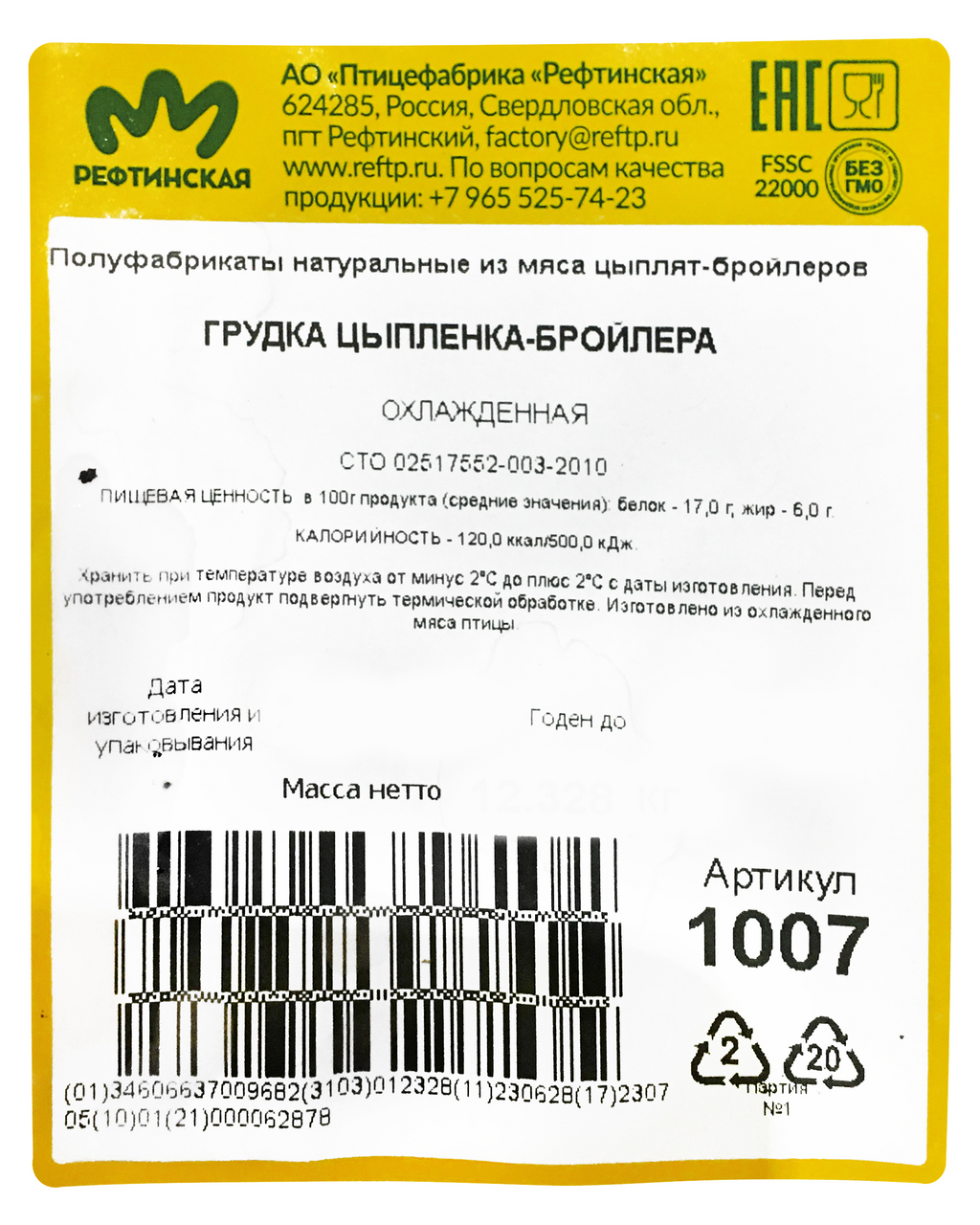 Грудка цыпленка-бройлера Рефтинская охлажденная, ~12кг