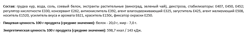 Грудка кур, вода, соль, соевый белок, экстракты растительные (виноград, зеленый чай), декстроза, стабилизаторы: E407, E450, E452, регулятор кислотности E330, консервант Е262, антиокислитель E392, агент влагоудерживающий E325, загуститель Е425, агент желирующий E508, носитель E1520, усилитель вкуса и аромата Е621, краситель Е150с, фиксатор окраски E250.