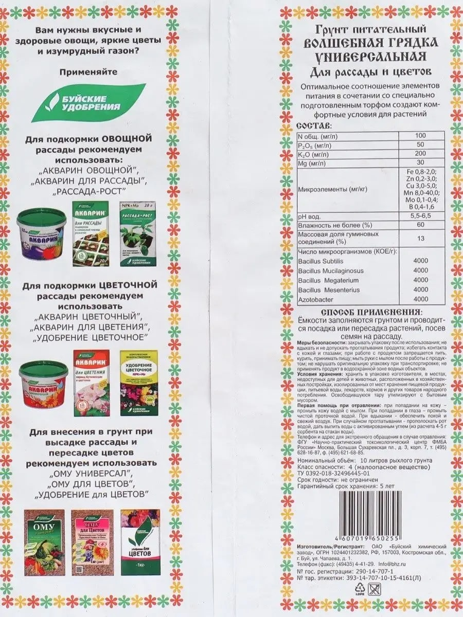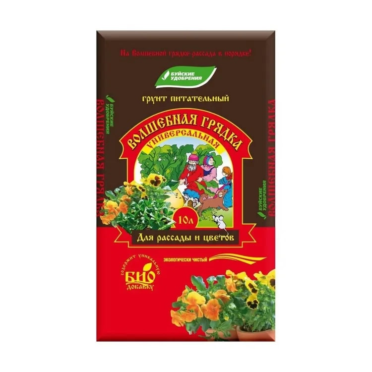 Грунт питательный Волшебная Грядка универсальный, 10 л – грунт для выращивания рассады овощных и цветочных культур, декоративных горшечных растений и выгонки зеленых культур. Приготовлен на основе нейтрализованного верхового торфа с добавлением в сбалансированном соотношении необходимых макро— и микроэлементов. Специализированные грунты для выращивания цветов и рассады, овощных и декоративных культур содержат сбалансированный по макро— и микроэлементам состав. Оптимальные агрофизические свойства создают прекрасные условия для развития растений. Грунт полностью готов к применению. Он усиливает цветение и завязывание плодов, повышает приживаемость растений, увеличивает сопротивляемость неблагоприятным условиям среды, болезням.