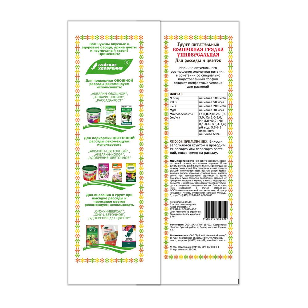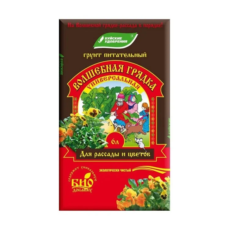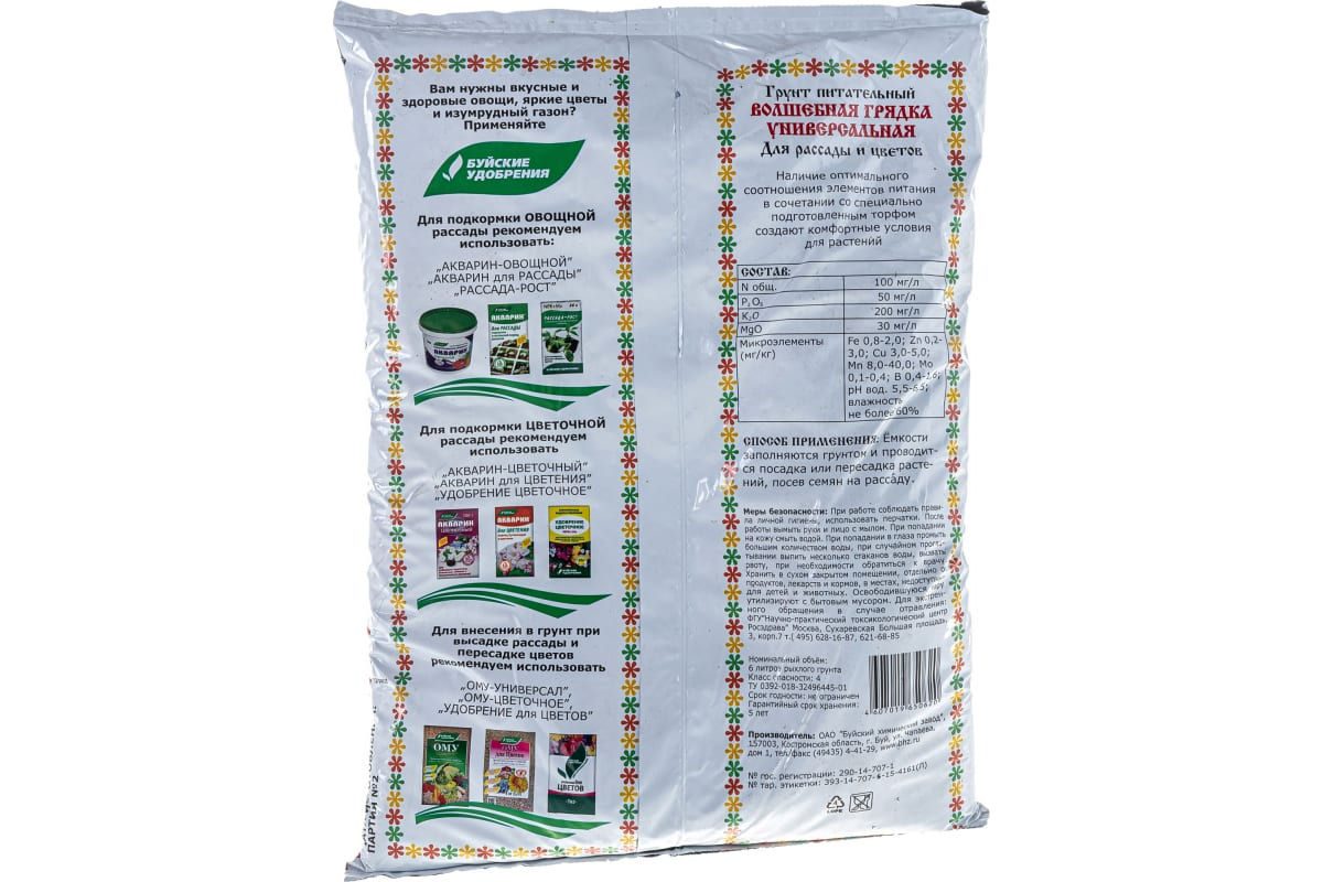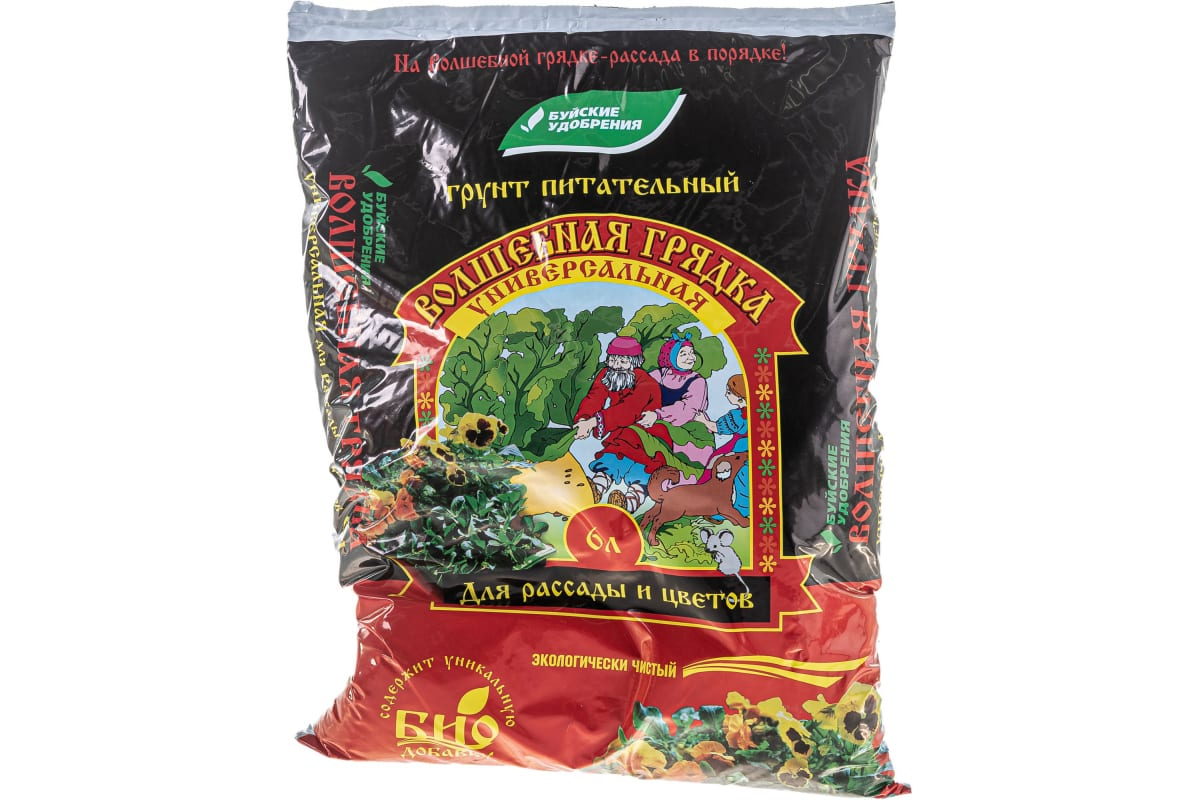 Грунт питательный Волшебная Грядка универсальный, 6 л – грунт для выращивания рассады овощных и цветочных культур, декоративных горшечных растений и выгонки зеленых культур. Приготовлен на основе нейтрализованного верхового торфа с добавлением в сбалансированном соотношении необходимых макро— и микроэлементов. Специализированные грунты для выращивания цветов и рассады, овощных и декоративных культур содержат сбалансированный по макро— и микроэлементам состав. Оптимальные агрофизические свойства создают прекрасные условия для развития растений. Грунт полностью готов к применению. Он усиливает цветение и завязывание плодов, повышает приживаемость растений, увеличивает сопротивляемость неблагоприятным условиям среды, болезням.