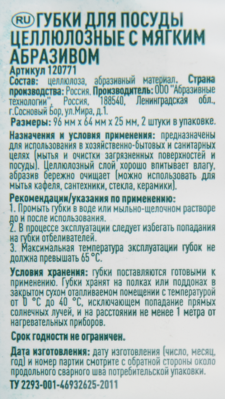 METRO PROFESSIONAL Губки для посуды целлюлозные с мягкой абразивностью 9.6 x 6.4 x 2.6см, 2шт