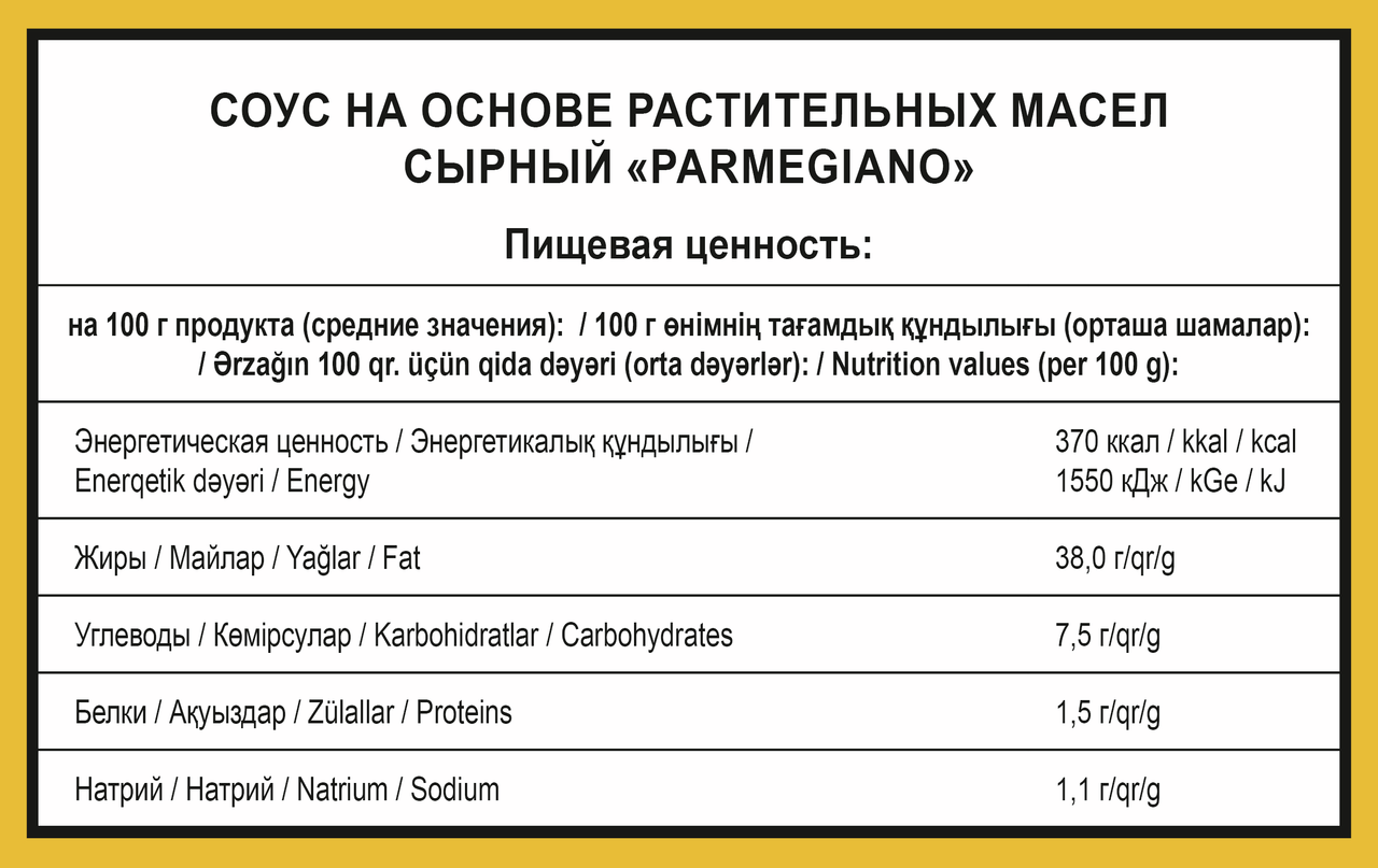 Вода, масло подсолнечное рафинированное дезодорированное, сахар, продукты яичные, соль, сыр (содержит уплотнитель Е509, лактозу), ароматизаторы натуральные (содержат глютен), волокна пищевые цитрусовые, регуляторы кислотности (Е260, Е270), загустители (Е1422, Е415, Е412), консерванты (Е202, Е211), антиокислитель Е385, красители (Е100, Е160с). Без использования ГМО. Содержит лактозу.