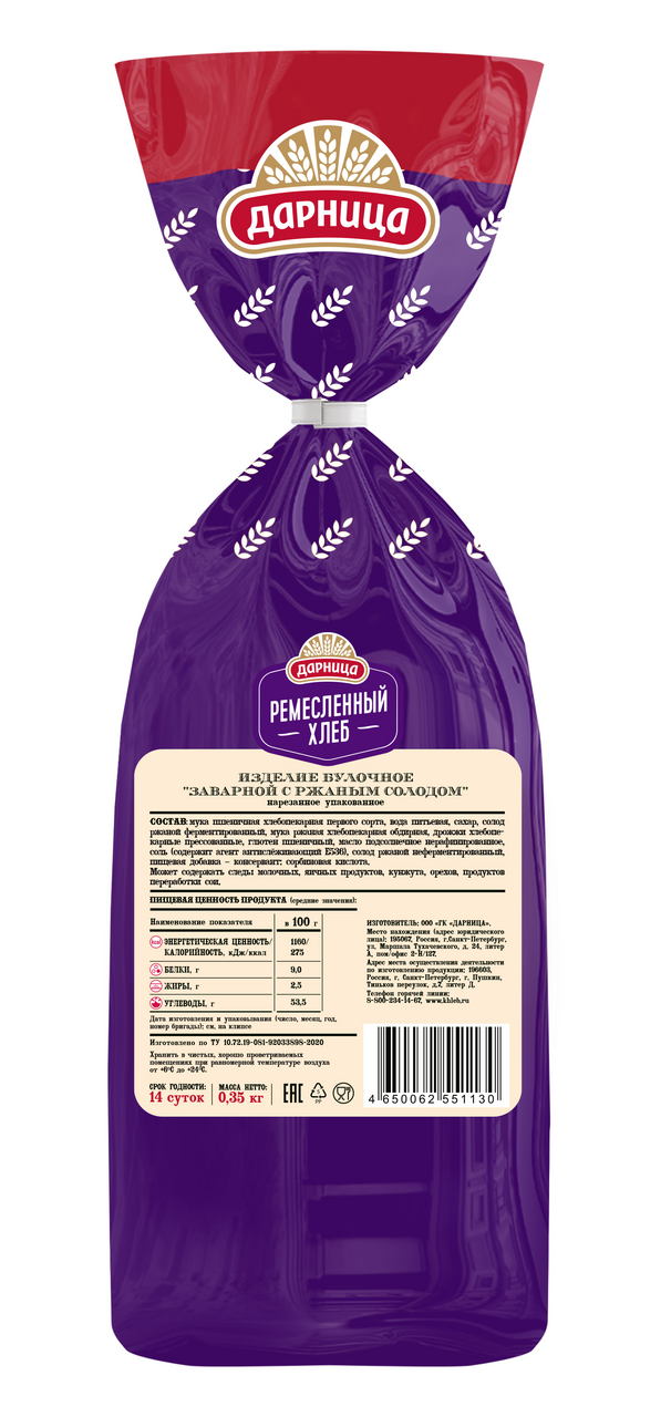 Заварное подовое булочное изделие на ржаной закваске. Изготовлен из смеси ржаной и пшеничной муки с добавлением солодовенных ржаных хлопьев и ароматного солода. А выпекается как в старину - в печах с каменным подом, неизменно радуя красивой аппетитной корочкой и насыщенным ароматом.