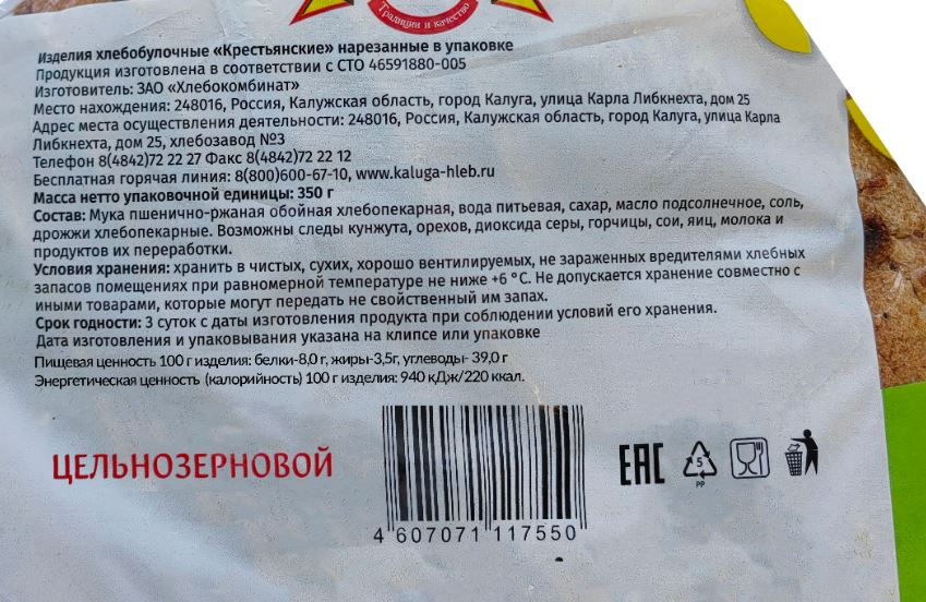 Хлеб Калужский хлебокомбинат Крестьянский нарезка, 350г