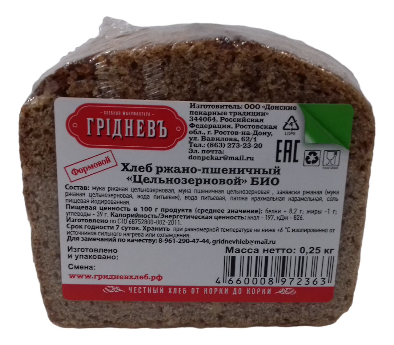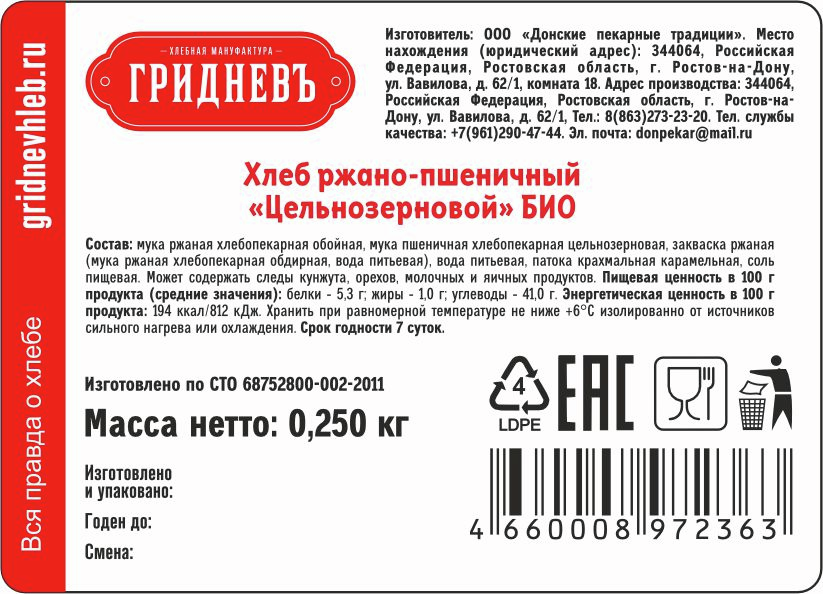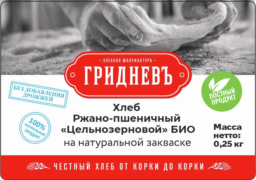 Хлеб Гридневъ ржано-пшеничный цельнозерновой био, 250г
