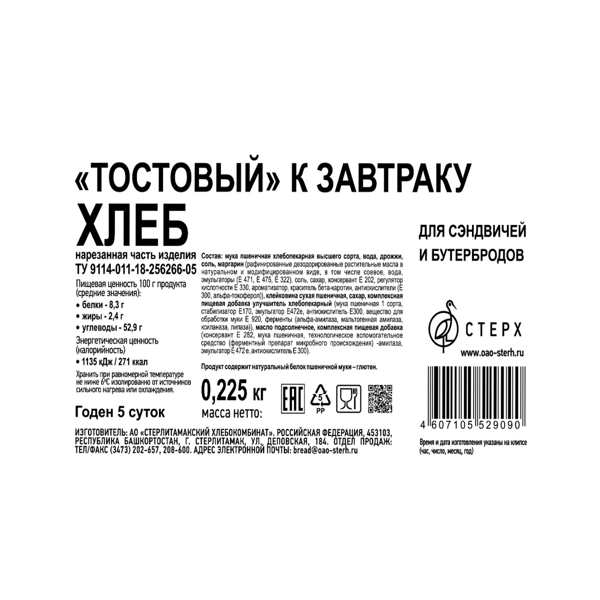 Хлеб Стерх тостовый к завтраку нарезка, 225г