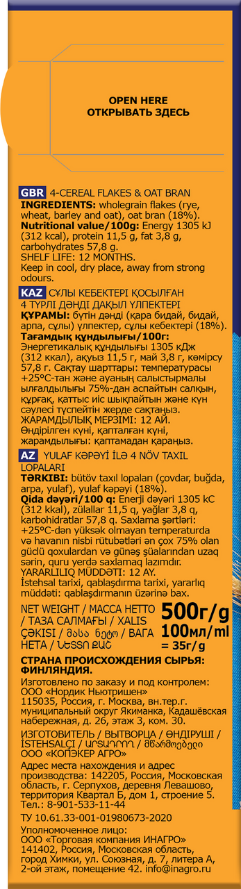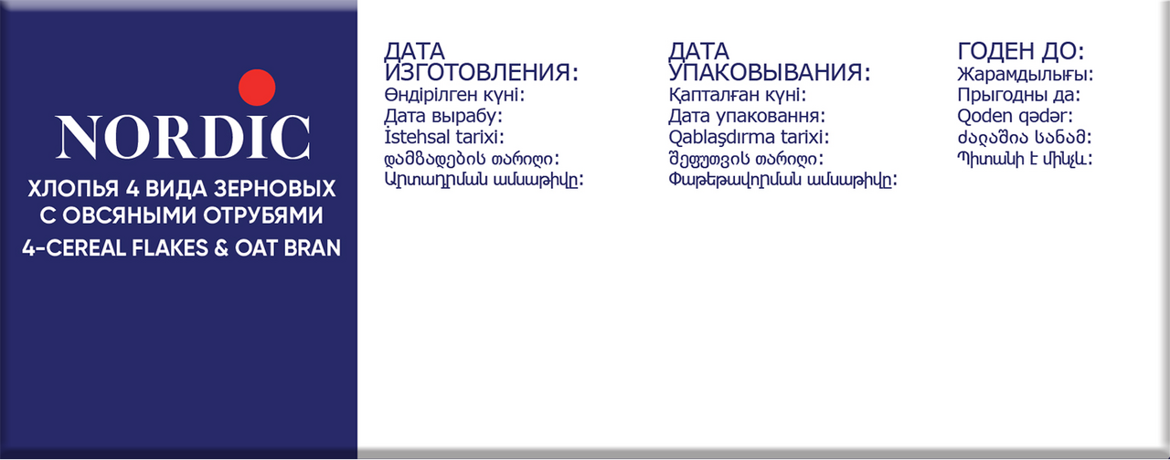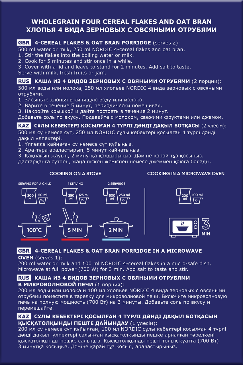 Хлопья 4 вида зерновых с овсяными отрубями — вкусный и полезный продукт, настоящий завтрак красоты, содержит кальций и фосфор, витамины группы В, микроэлементы и аминокислоты. Высокое содержание клетчатки улучшает моторику кишечника и пищеварение. Овсяная крупа богата белками, углеводами, калием, фосфором, цинком, фтором, йодом, провитамином A, витаминами группы В. Хлопья овсянки содержат почти все необходимые человеку полезные аминокислоты и микроэлементы, включая железо и эфирные масла. Продукт не содержит консервантов, ароматизаторов и красителей. Хлопья овсяные Nordic с пшеничными отрубями из цельного овса с добавкой пшеничных отрубей. Высокое содержание клетчатки.