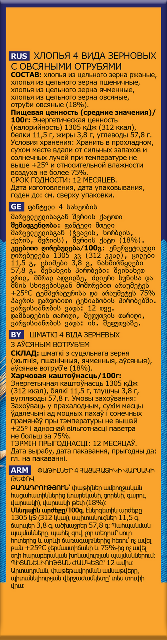 Хлопья из цельного зерна (ржаные, пшеничные, ячменные, овсяные), овсяные отруби (18%).