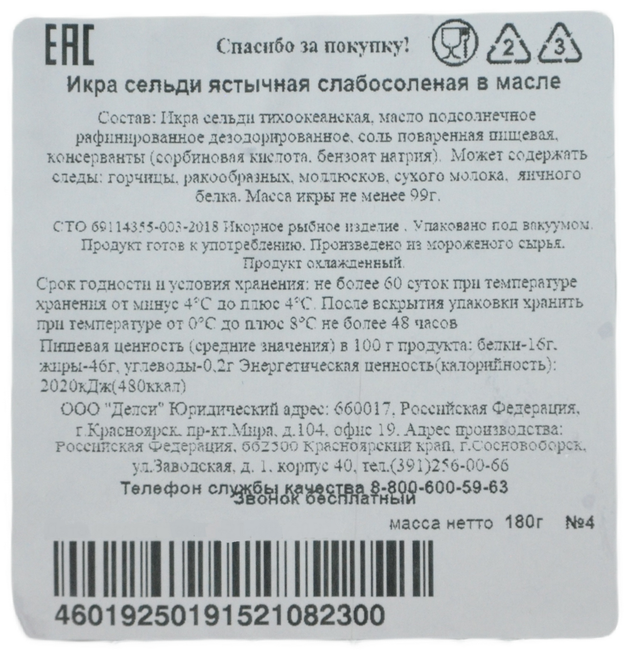 Икра сельди тихоокеанская, масло подсолнечное рафинированное дезодорированное, соль поваренная и пищевая, консерванты (бензоат натрия, сорбиновая кислота).