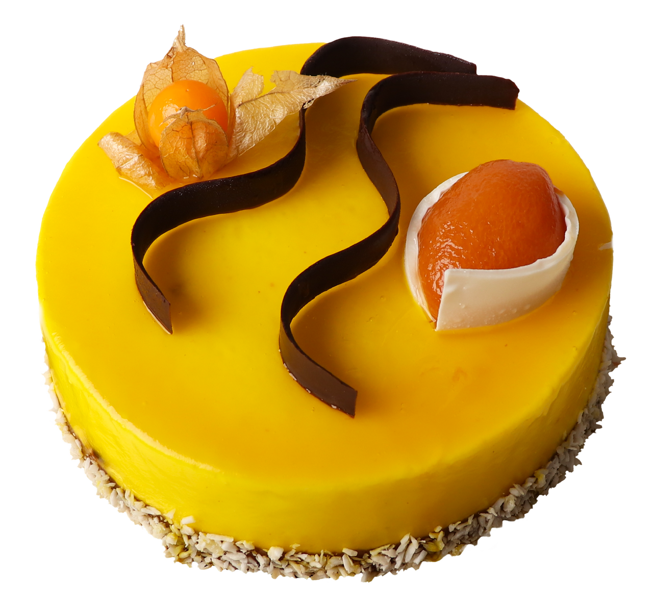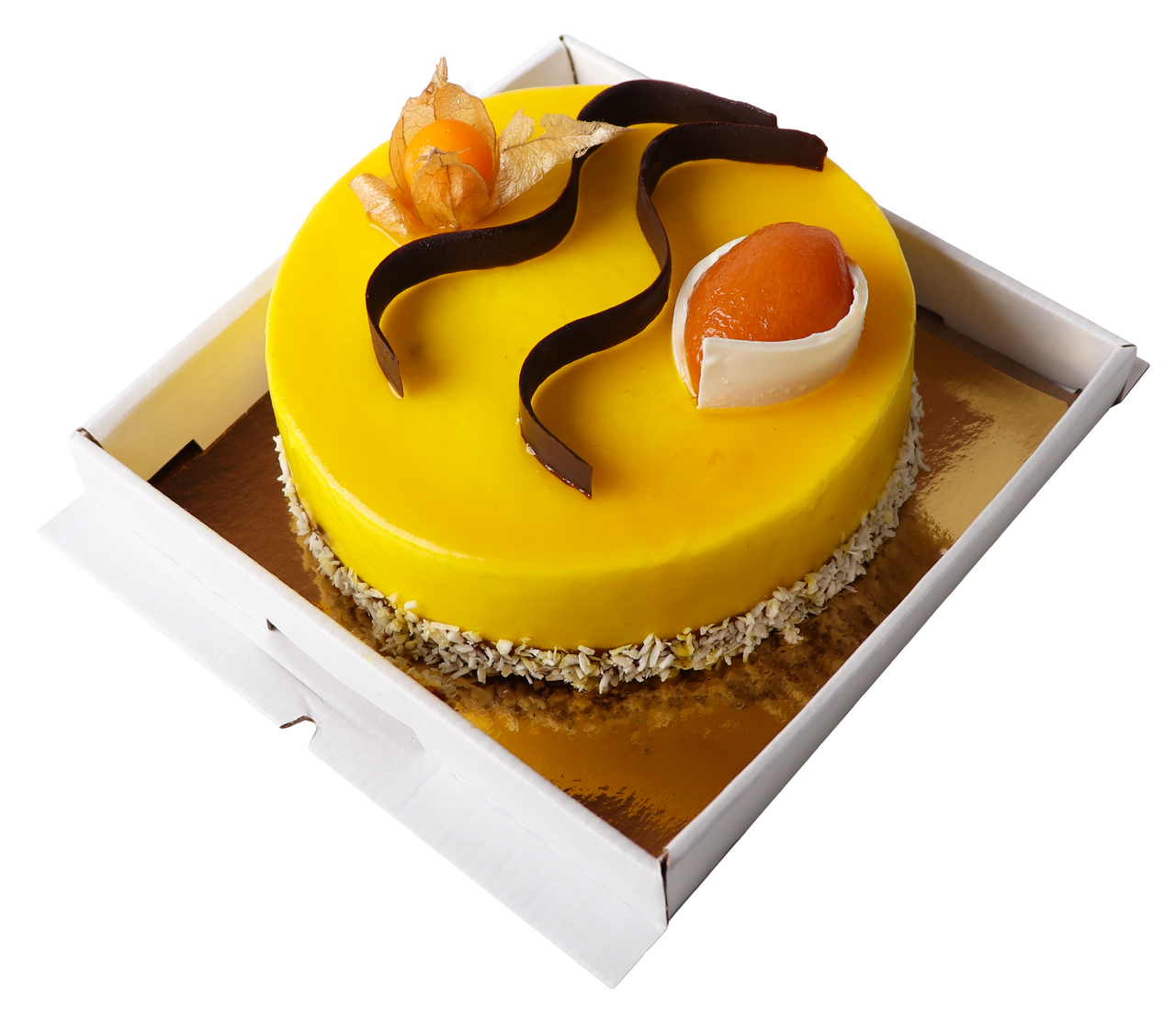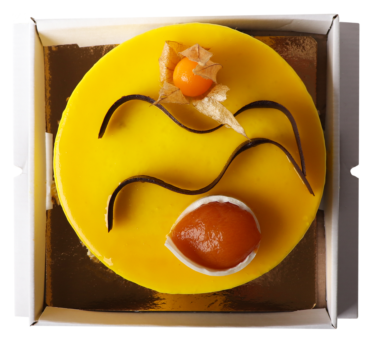 Воздушный белый бисквит, пропитанный сиропом из черной смородины, воздушный мусс из йогурта персик – маракуя из натуральных сливок, прослойка желе из пюре манго сорта альфонсо и пюре маракуя, ягоды черной смородины, залит персиковым гляссажем, обсыпан кокосовой стружкой, украшен ягодами и шоколадным декором.