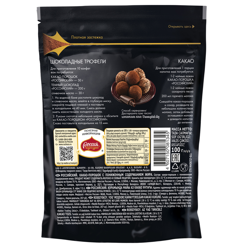 Какао-порошок Россия Щедрая душа, 100 г – натуральный и очень полезный продукт с ярко выраженным вкусом и ароматом. Производитель использует при изготовлении исключительно натуральное сырье, отборные какао-бобы. Какао-порошок используется для приготовления горячего напитка. Достаточно добавить сахар, залить молоком, сливами и довести до кипения, непрерывно помешивая. Какао также является незаменимым ингредиентом во многих десертах, тортах, выпечке, им посыпают мороженое. Он добавляется в тесто и кремы, придавая готовому изделию неповторимый вкус и насыщенный, красивый цвет.