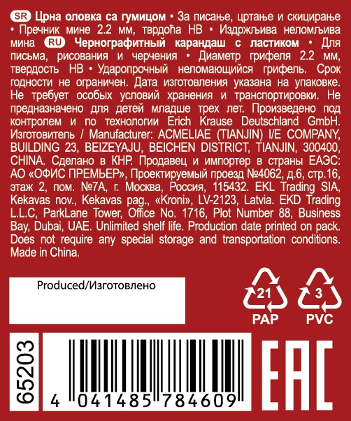 Круглый чернографитный карандаш из отборной древесины с ластиком, твердость НВ. Специальная пропитка древесины и сплошная проклейка грифеля обеспечивает высокую ударопрочность. Мягкая древесина и идеальная центровка грифеля гарантируют легкую заточку с экономным расходом карандаша. Грифель диаметром 2.2мм не царапает бумагу и не крошится. Ластик карандаша средней жесткости изготовлен из экологически чистого и гипоаллергенного материала термопластичной резины (TPR). Не содержит ПВХ. Длина 188мм.