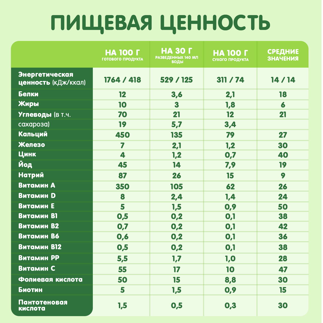 Мука пшеничная, мука овсяная, мука гречневая, сахар, молоко сухое обезжиренное, масло подсолнечное высокоолеиновое, карбонат кальция, витамины: (С (аскорбат натрия), РР, Е, пантотеновая кислота, В6, В2, В1, А, фолиевая кислота, D3, D-биотин, В12), минеральные вещества: железо, цинк, йод).