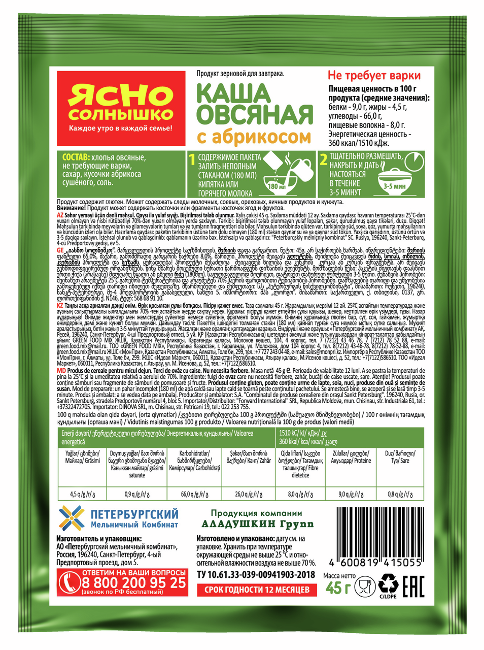 Это каша моментального приготовления, не требующая варки. Она сделана из натуральных ингредиентов без добавления ароматизаторов, консервантов, красителей и стабилизаторов. В ее состав входят овсяные хлопья, обработанные по технологии двойного пропаривания, кусочки сушеного абрикоса, немного сахара и соли. Готовить ее проще простого: переложите смесь в тарелку, залейте 180 мл кипятка или горячего молока, оставьте под крышкой на 3-5 минут и наслаждайтесь вкусным и полезным завтраком.