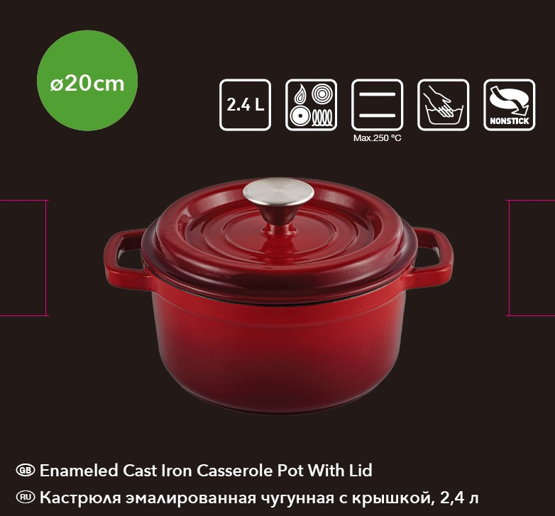 Кастрюля чугунная эмалированная 20см (20х9см) 2,4л с крышкой. Цвет - красный. Ручка из нержавеющей стали. Жаропрочность до 250С. Подходит для всех видов плит, в том числе индукционных. Можно использовать в духовке. Нельзя мыть в посудомоечной машине. Размеры кастрюли (г x ш x в, диаметр): 20 x 20 x 9см, 20. Вес - 3,3кг. Гладкое покрытие устойчиво к впитыванию посторонних запахов и не окрашивается.
