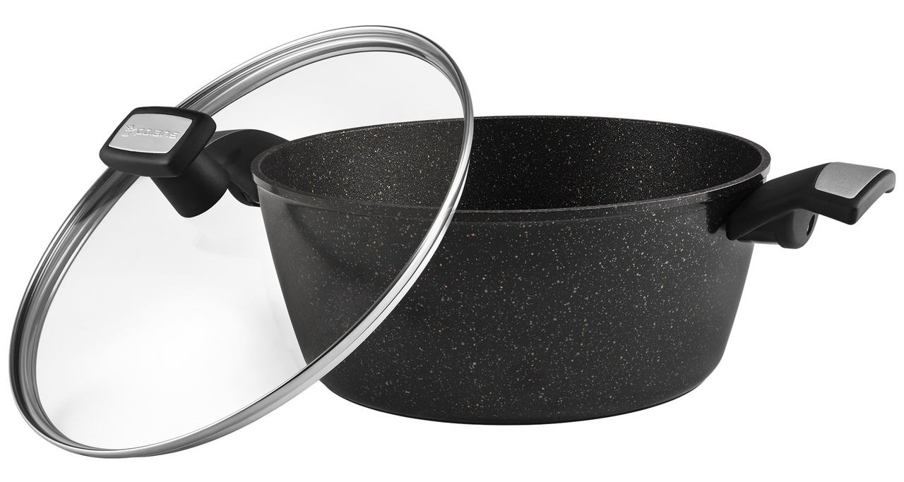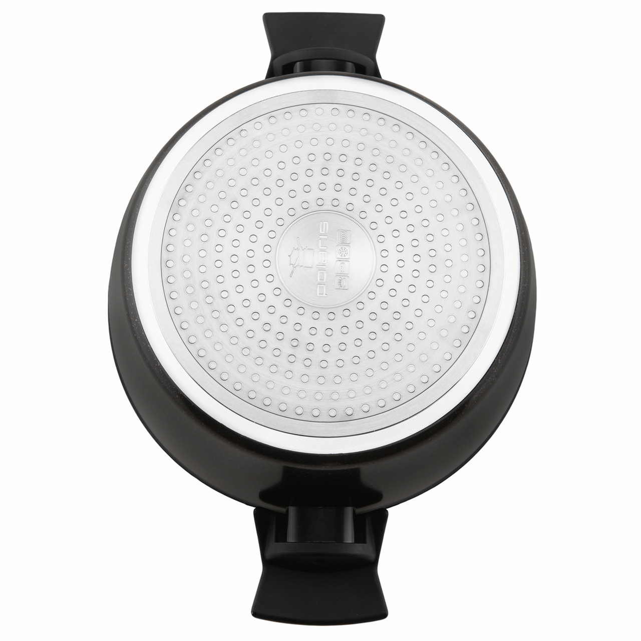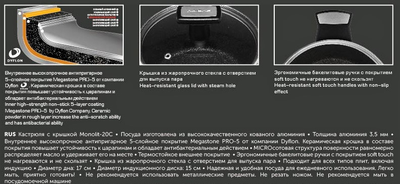 Megastone Pro-5 Инновационное 5-слойное антипригарное покрытие с керамической крошкой.Материал - кованый алюминий.Внутреннее покрытие - высокопрочное антипригарное 5-слойное покрытие с керамической крошкой в составе Megastone PRO-5 от компании Dyflon.Microсотовая структура поверхности равномерно распределяет масло и удерживает его на месте.Термостойкое внешнее покрытие.Ручки - эргономичные бакелитовые ручки с покрытием Soft Touch.Крышка из жаропрочного стекла с отверстием для выпуска пара.Подходит для всех типов плит, включая индукцию.Для надёжной работы посуды Polaris на вашей индукционной плите, обязательно уточните в инструкции к плите минимальный допустимый диаметр дна посуды для каждой конфорки. Диаметр дна посуды указан в характеристиках.