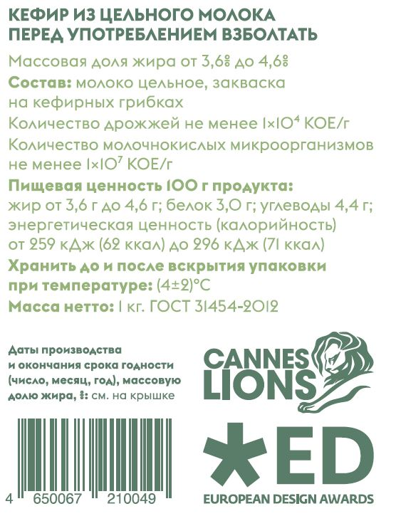 Экологически чистый, натуральный кефир. Молоко для производства кефира получено от коров Голштинской породы с собственных ферм братьев Чебурашкиных. Содержит естественную, природную долю молочного жира. Секрет качества кефира и его пользы для здоровья заключен в живых кефирных грибках, которые выращиваются под контролем собственной сертифицированной лаборатории братьев Чебурашкиных. Также использование данной закваски добавляет во вкус кефира пикантную остроту. Не содержит сухое молоко, антибиотики и гормоны. Чистая технология розлива позволяет надежно сохранить продукт без использования консервантов.