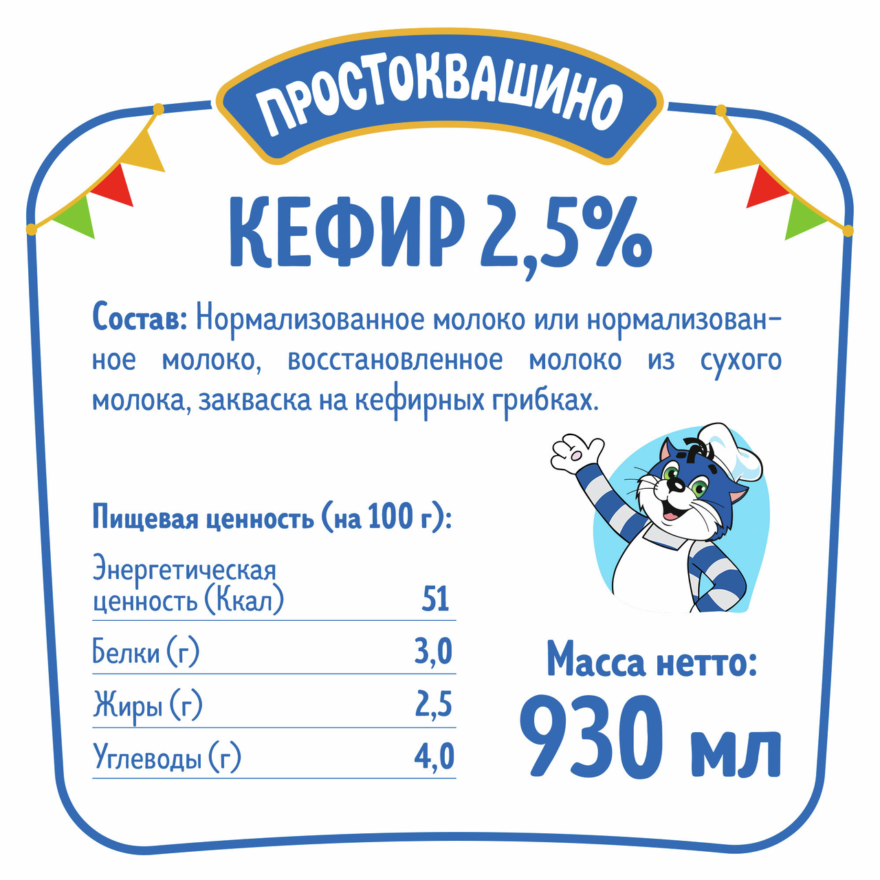 Кефир Простоквашино 2,5% БЗМЖ (без заменителя молочного жира), 930 г – это полезный продукт, который рекомендуется употреблять ежедневно. Изготавливается из продуктов высокого качества, для закваски добавляются полезные бифидобактерии. При регулярном применении кефира стабилизируется работа желудочно-кишечного тракта, укрепляется иммунитет, мышечные и костные ткани, сводится к минимуму риск развития артрита, кариеса, ускоряется процесс восстановления после физических упражнений. Напиток выделяется приятным обволакивающим вкусом, присутствует, характерная кефиру, кислинка. Можно употреблять в чистом виде, а также готовить на основе различные блюда: оладьи, блины, выпечку. В кефир можно добавить отруби, гранолу или овсяные хлопья, п��сле чего напиток становится питательным полезным перекусом или легким ужином.