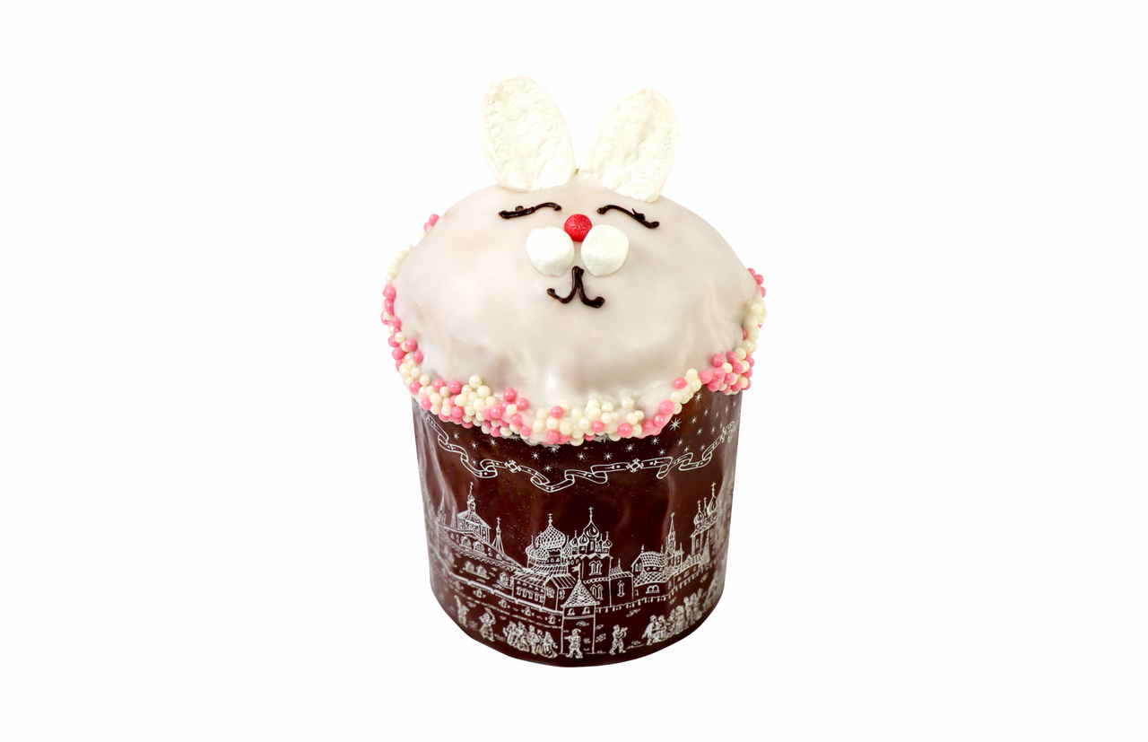 Кекс в форме кулича, поверхность залита глазурью, оформлен драже в кондитерской глазури, зефиром маршмеллоу. Мягкая ароматная и очень вкусная выпечка с изюмом.
