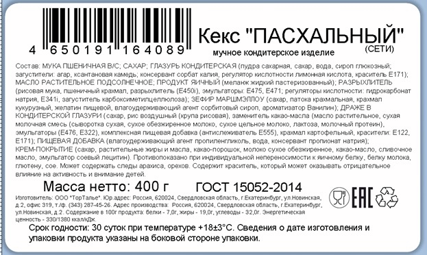 Мука пшеничная в/с, сахар, глазурь кондитерская (пудра сахарная, сахар, вода, сироп глюкозный, загустители: агар, ксантановая камедь, консервант сорбат калия, регулятор кислотности лимонная кислота, краситель Е171), масло растительное подсолнечное, продукт яичный (меланж жидкий пастеризованный), разрыхлитель (рисовая мука, пшеничный крахмал, разрыхлитель (e4501), эмульгаторы, e475, e471, регуляторы кислотности, гидрокарбонат натрия, e3411, загуститель карбоксиметилцеллюлоза), зефир маршмэллоу (сахар, патока крахмальная, крахмал кукурузный, желатин пищевой, влагоудерживающий агент сорбитовый сироп, ароматизатор ванилин), драже в кондитерской глазури (сахар, рис воздушный (крупа рисовая), заменитель какао-масла (масло растительное, сухая молочная смесь (сыворотка сухая, сухое обезжиренное молоко, сухое цельное молоко, лактоза, молочный протеин), эмульгаторы (e476, e322), комплексная пищевая добавка (антислеживатель e555), крахмал картофельный, красители: e122, e171), пищевая добавка (влагоудерживающий агент пропиленгликоль, вода, консервант пропионат натрия), крем-покрытие (сахар, растительные миры и масла, какао-порошок, молоко сухое обезжиренное, какао-масло, сливочное масло, эмульгатор соевый лецитин).