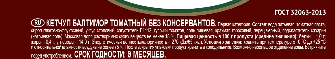 Вода, томатная паста, сироп глюкозно-фруктозный, уксус, загуститель Е1442, кусочки томатов, соль, крахмал гороховый, перец черный, подсластитель сахарин (натриевая соль).