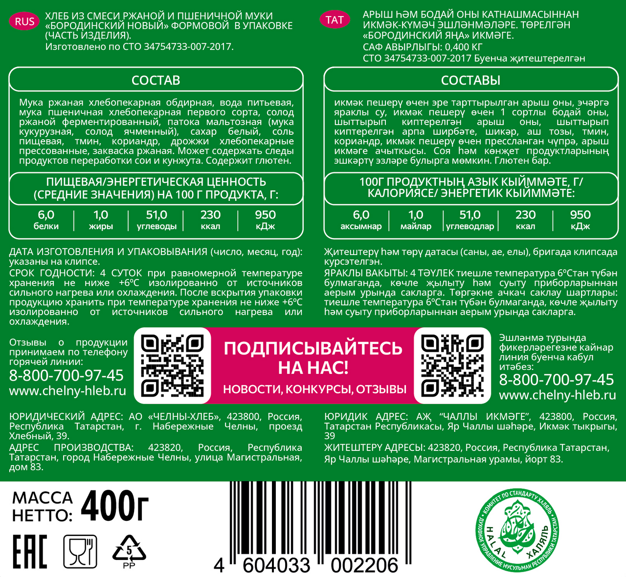 Хлеб Бородинский новый Халяль от торговой марки Челны-хлеб – нежный хлебобулочный продукт, приготовленный в соответствии с требованиями стандарта. В составе продукта отборная пшеничная и ржаная мука, патока и солод. Идеальный хлеб для приготовления хрустящих тостов, сытных сэндвичей и праздничных канапе.