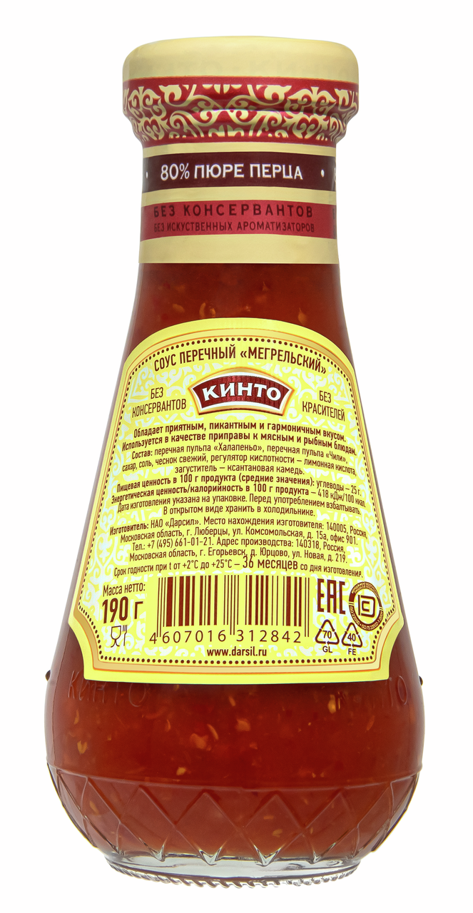Соус Мегрельский перечный бренда Кинто идеально подойдет для блюд грузинской кухни. Он характеризуется острым вкусом и нежной текстурой, отлично сочетается с рыбными блюдами, запеченной птицей. Особенно хорошо соус раскрывает вкус жареной говядины, свинины и других горячих закусок. Часто мегрельский перечный соус используют для маринада. Он полезен своим натуральным составом, богат витаминами и микроэлементами.
