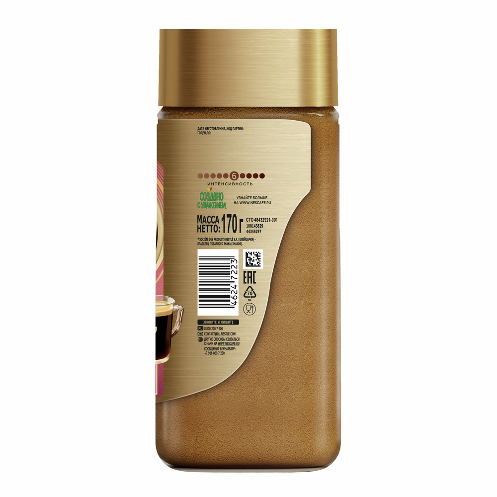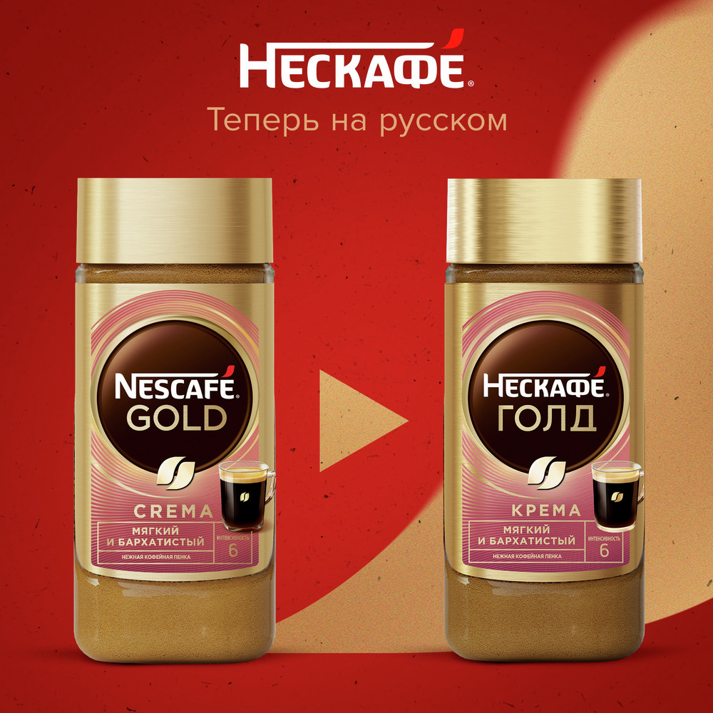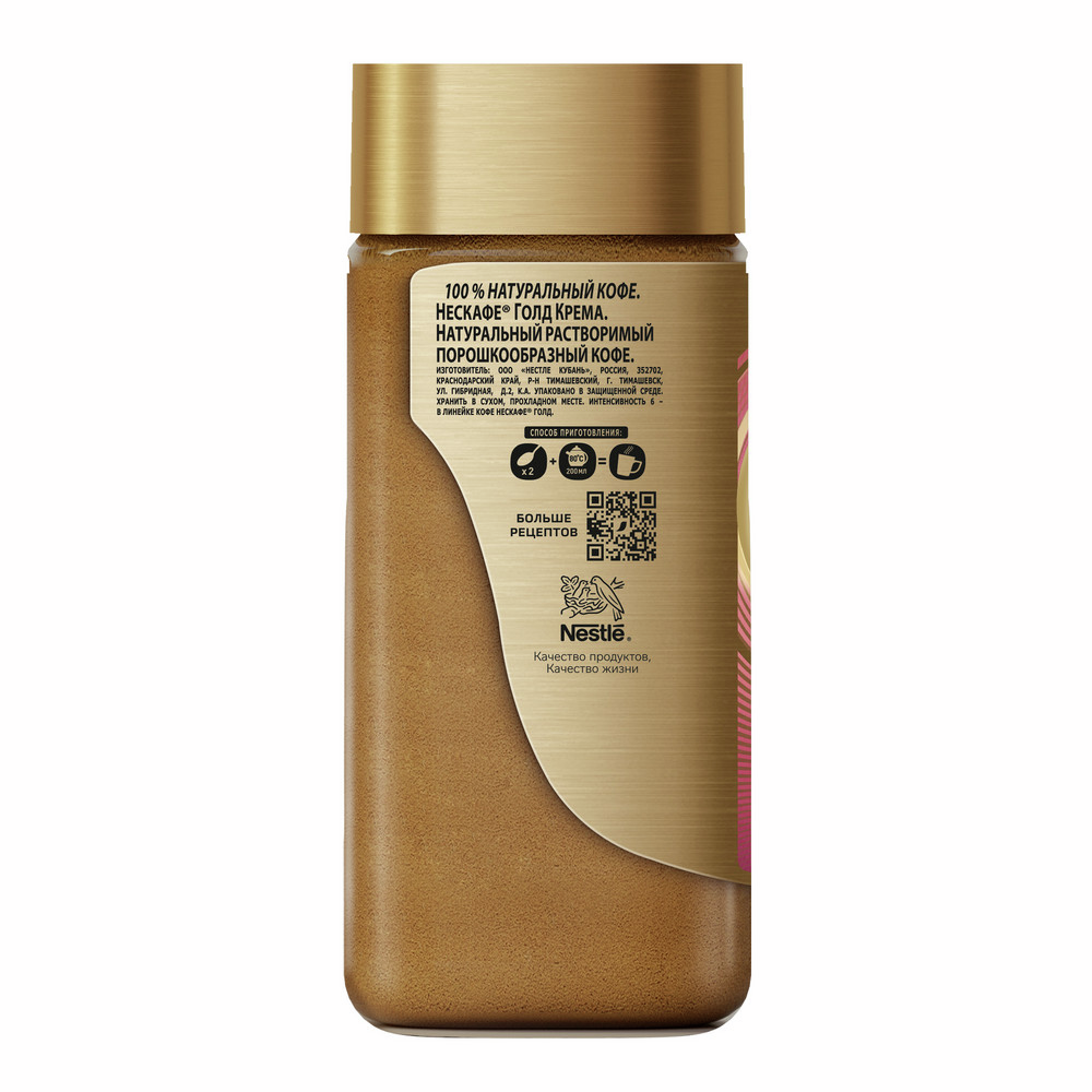 Нежная пенка, превосходный аромат арабики и многогранный вкус до последней капли - ощутите это сами в каждой чашке. Эксперты создали Gold Crema, чтобы вы могли наслаждаться его мягким бархатистым вкусом в любое время. На производстве тщательно обжаривают кофейные зерна, чтобы раскрыть все грани вкуса и аромата арабики в каждой чашке Нескафе. А нежная кофейная пенка сохраняет их для вас. Секрет плотной и нежной пенки НескафеGold Crema состоит в особых аэро гранулах, которые поднимаются в процессе приготовления. Чтобы получить порцию кофе, положите 2 ложки быстрорастворимого напитка и залейте их горячей, но не кипящей водой. По желанию можно добавить сахар, молоко или сливки. Продукт рекомендуется употребить в течение 70 дней после вскрытия упаковки. Натуральный растворимый порошкообразный кофе, приготовленный только из отборных кофейных зерен. Нежная кофейная пенка напитка сохраняет мягкий вкус Арабики до последней капли.