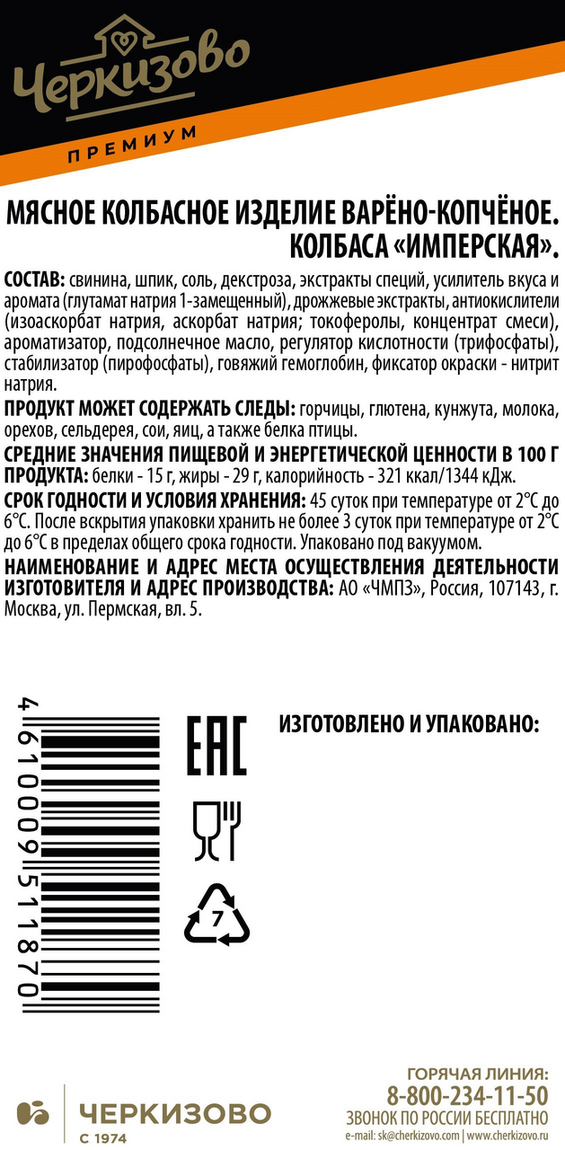 Колбаса Черкизово Имперская, для приготовления которой используются отборные свинина и говядина, является отличной закуской. Приготовлена она по специальной рецептуре с добавлением ароматных пряностей. Продукт имеет упругую структуру с небольшим количеством шпика, который придает вкусу пикантность. При нарезке колбаса не крошится и не пачкает рук.