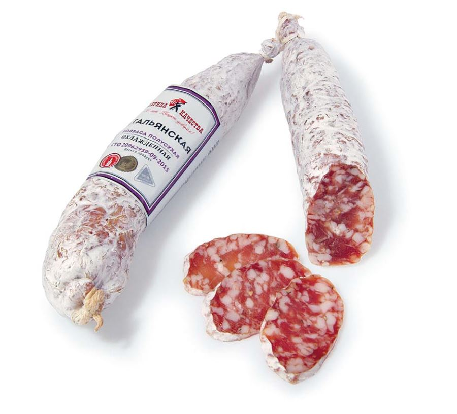 Колбаса Фабрика Качества Итальянская сыровяленая представляет собой приготовленное по итальянскому рецепту ароматное, с насыщенным мясным вкусом изделие. Производится из тщательно подобранных специй и мяса. Это изысканный деликатес, который понравится и домочадцам, и гостям. Свои вкусовые качества приобретает благодаря особой технологии производства. Ее можно подать в виде нарезки на тонкие слайсы. Они хорошо сочетаются с цельнозерновым хлебом или поджаренными тостами. Колбаску можно предложить в качестве закуски к алкогольным напиткам. Сочное колбасное изделие зарядит энергией на весь день. В нем много белка и калорий, поэтому оно хорошо насыщает и восстанавливает силы. Из сыровяленого продукта можно приготовить вкусные бутерброды для перекуса, которые удобно взять с собой на прогулку или пикник.
