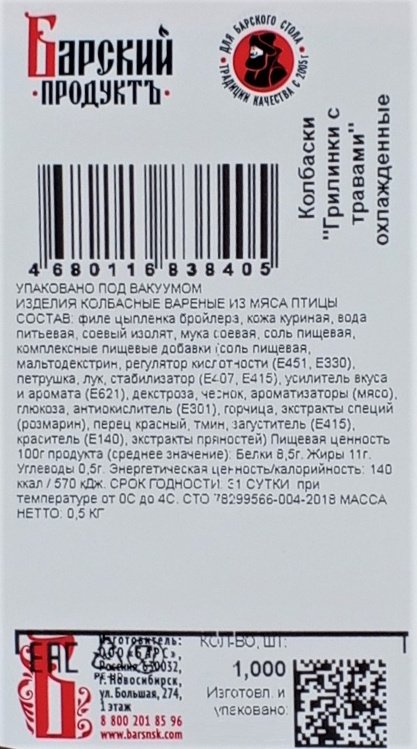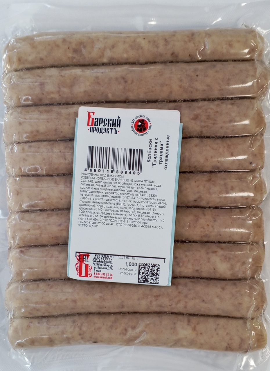 Грилинки с травами 0,5кг (готовые колбаски куриные). Только подогреть до румяной корочки 2 минуты (аэрогриль, микроволновка, с маслом на сковороде). Можно есть, не снимая оболочку.