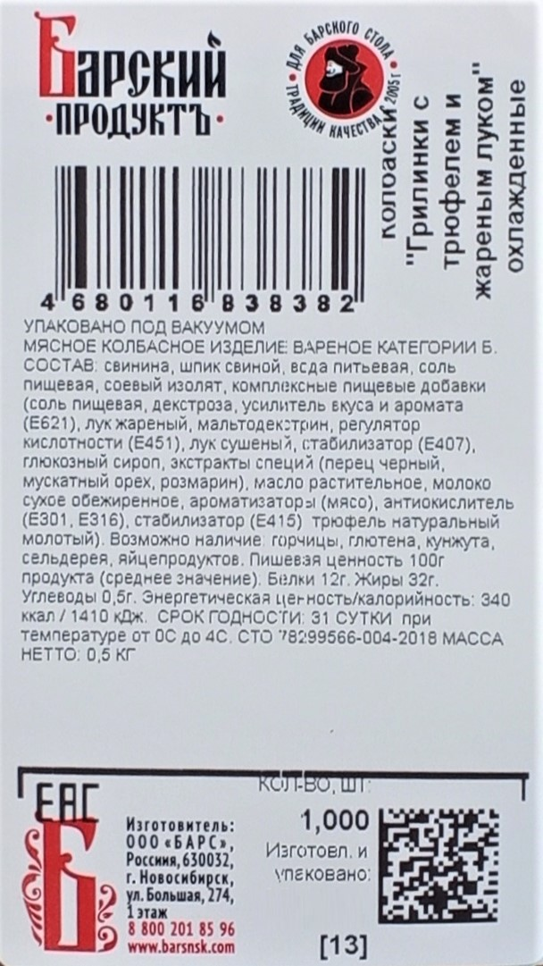 Колбаски Барский продукт Грилинки трюфель и жареный лук, 500г