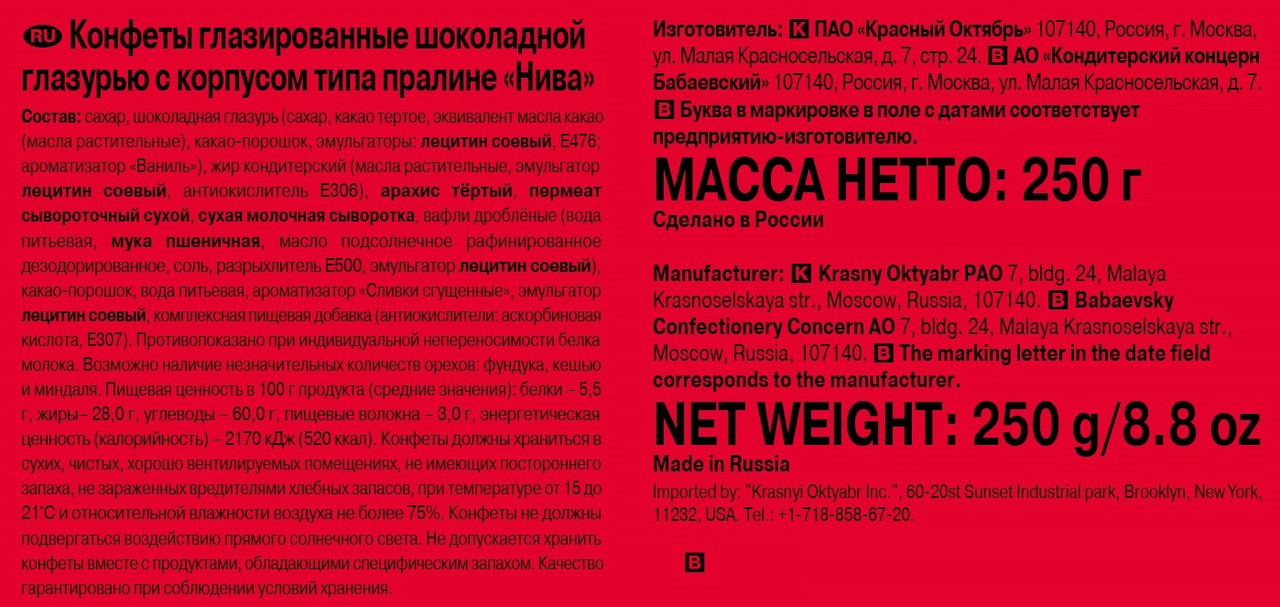 Конфеты Нива - нежное плотное пралине, в меру сладкое, с насыщенным ореховым привкусом, легкими сливочно-ванильными нотками и легким похрустыванием вафельных крошек прекрасно дополняет как чай любых сортов, так и кофе.