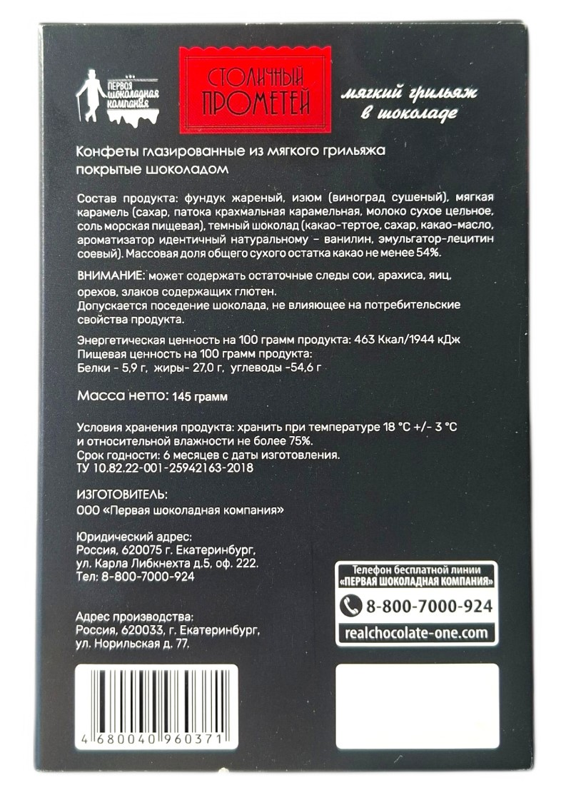 Конфеты Прометей столичный грильяж в шоколаде, 145г