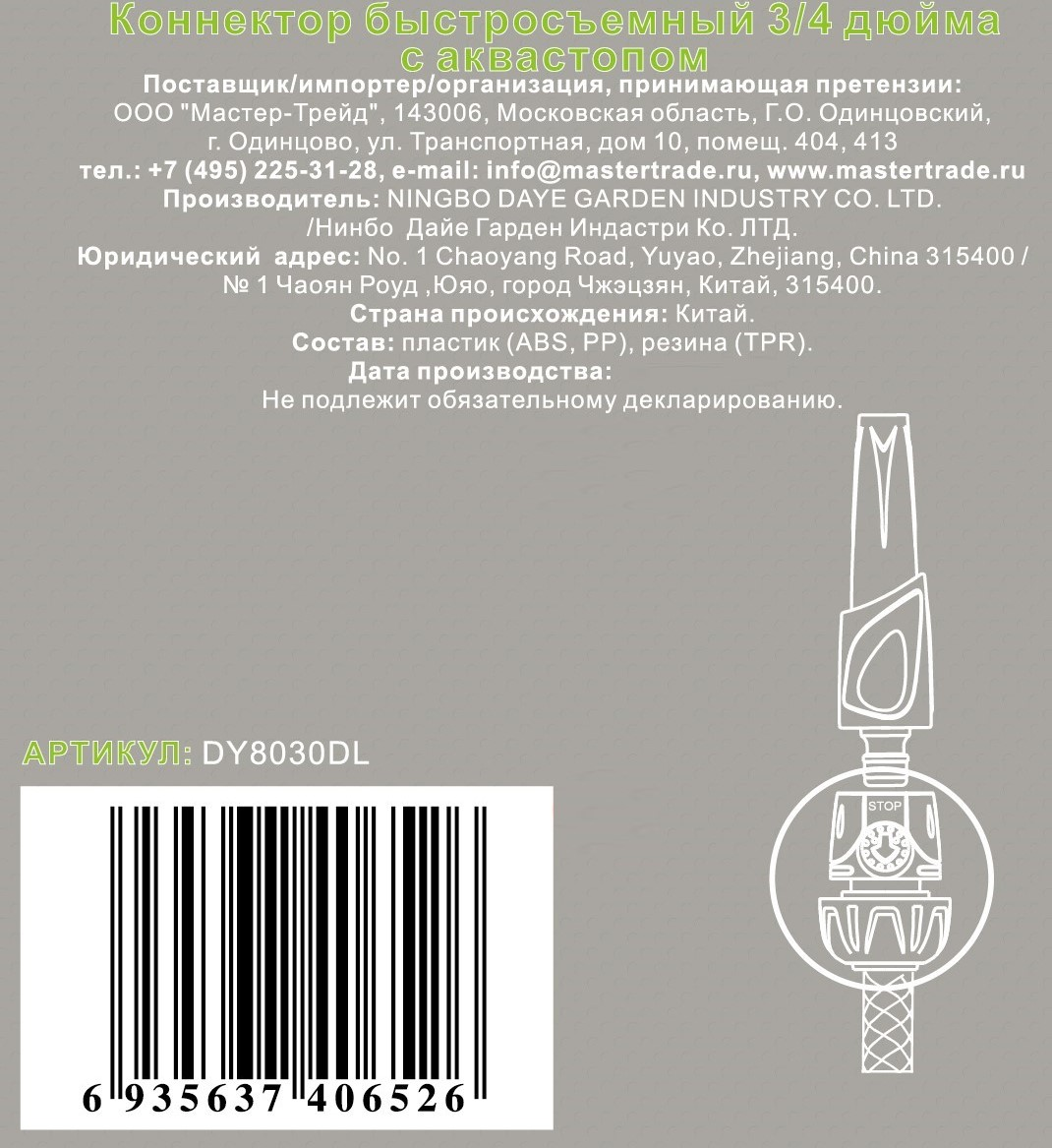 Коннектор быстросъемный 3/4 дюйма с аквастопом изготовлен из РР - полипропилен + АБС-пластик - ударопрочная техническая термопластическая смола на основе сополимера акрилонитрила с бутадиеном и стиролом + TPR или термопластичная резина.