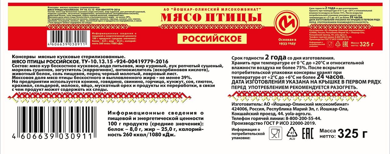 Мясо птицы Йошкар-олинский МК Российское ГОСТ, 325г
