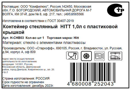Контейнер Hitt 1л - основание контейнера изготовлено из боросиликатного термостойкого стекла, которое устойчиво к перепадам температуры. 100% герметичный контейнер. Подходит для использования в микроволновой печи и духовом шкафу (без крышки), можно мыть в посудомоечной машине. Стеклянный контейнер не окрашивается в процессе использования, не деформируется, не впитывает влагу и запахи. Контейнер абсолютно герметичен, содержимое надёжно защищено даже при переворачивании. Особая конструкция крышки имеет отверстие, через которое выходит избыточная влага или пар. Жаропрочное стекло выдерживает нагрев 220С/400С.