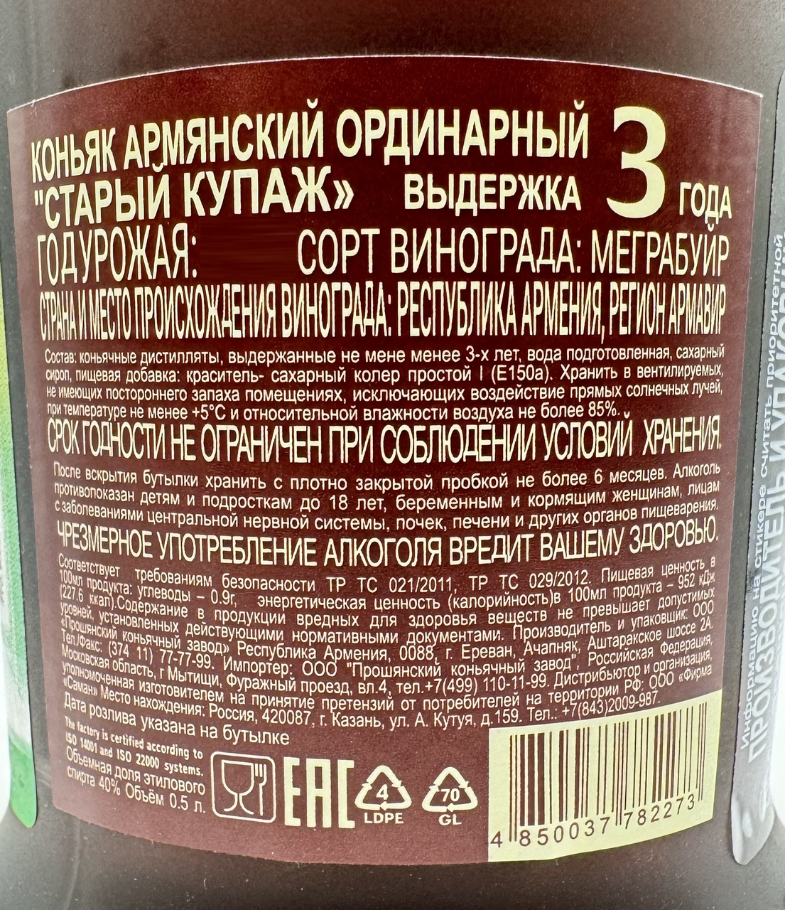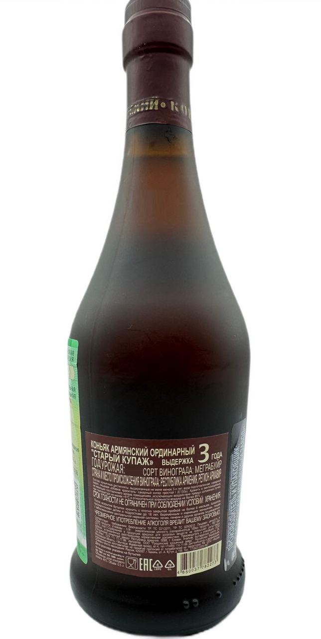Коньяк Старый Купаж Армянский, 3 года, 0,5л представляет собой крепкий напиток, который проходит длительную выдержку в дубовых бочках. Так она наполняется силой, выразительными нотками во вкусе и аромате. Крепкий напиток отличается насыщенным темно-золотистым цветом, красиво переливающимся в тюльпановидном бокале. Выразительный, маслянистый вкус раскрывается характерными коньячными нотками, умеренной сладостью. Они находят отражение в длительном послевкусии. Приятный, соблазнительный аромат напитка представлен традиционными коньячными нотками. Подавать коньяк следует как дижестив, с кубиками льда, кофе или теркой сигарой. Его можно использовать для приготовления различных коктейлей. Хранить коньяк рекомендуется в прохладном месте вдали от источников тепла и солнечных лучей. Перед сервировкой напиток рекомендуется немного охладить до температуры 18-20 С. Бутылка изысканного качественного напитка может стать оригинальным подарком близкому человеку, партнеру, коллеге и руководителю. Такой презент, наверняка, по достоинству оценит каждый получатель, а вы подчеркнете свой утонченный вкус. Старый купаж — торговая марка, которая принадлежит Араратскому винному заводу. Он был основан более 100 лет назад. Предприятие занимается выпуском различных вин, коньяка и спиртов. В основе напитков местные сорта винограда, которые выращиваются на собственных землях завода. Он регулярно проводит обновление оборудования, придерживается многовековых традиций в производстве винных и крепких напитков, тщательно следит за качеством и безопасностью. В 2000 году завод был удостоен золотой медали выставки Вин Экспо. Продукция компании популярна как в родной стране, так и далеко за ее пределами.