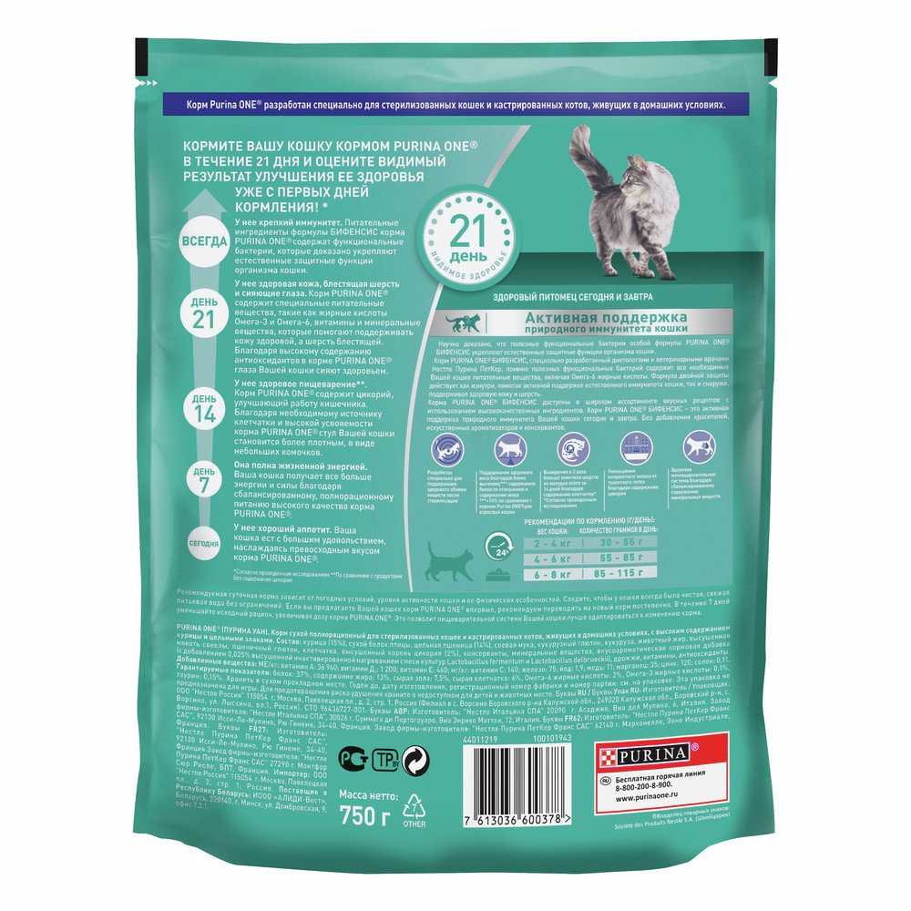 Корм для кошек Purina One (Пурина Уан) — полнорационный корм, разработанный ветеринарами и диетологами Purina специально для стерилизованных кошек и кастрированных котов старше 1 года, которые живут в домашних условиях. Корм Purina One с курицей для стерилизованных домашних кошек 750 г — это: курица — #1 ингредиент в составе; в 2 раза эффективнее выведение комочков шерсти из желудка всего за 14 дней* благодаря содержанию клетчатки; поддержание здорового обмена веществ после стерилизации; здоровая мочевыделительная система благодаря сбалансированному содержанию минеральных веществ; в составе натуральный пребиотик — цикорий, который поддерживает здоровую микрофлору кишечника и уменьшает неприятный запах от туалетного лотка**; поддержание здорового веса благодаря более высокому*** содержанию белка по отношению к содержанию жира; формула, которая поддерживает иммунитет вашей кошки, здоровье пищеварительной системы и блеск шерсти, обеспечивая видимые результаты для здоровья питомца сегодня и завтра. Рекомендации по кормлению: суточная норма зависит от погодных условий, физических особенностей и активности питомца; следите, чтобы у кошки всегда была свежая питьевая вода; дополняйте рацион влажными кормами Purina One для поддержания водного баланса; переводите на новый корм постепенно: в течение 7 дней плавно заменяйте исходный рацион на корм Purina One. Purina One. Экспертное питание — видимый результат. *Согласно проведенному командой Purina исследованию: Исследование специальной формулы для контроля выведения шерсти из систем пищеварения, 2001, Purina Pet Care,.Сент-Джозеф, США. **Согласно проведенному командой Purina исследованию: "Влияние цикория на запах стула кошки", 2002, Purina Pet Care, Сент-Джозеф, США. ***+15% по сравнению с кормом Purina One для взрослых кошек.